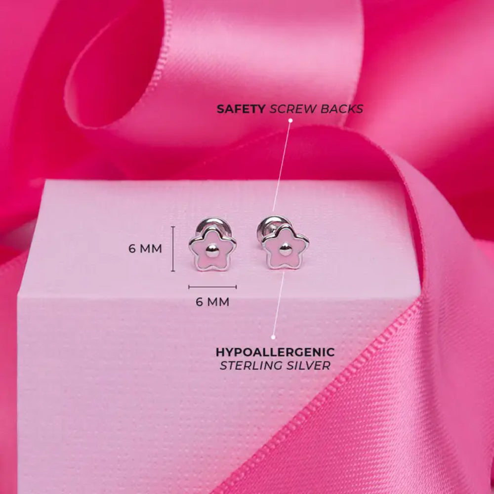 Fun meets modern in these cute 6mm flower screw back earrings. These girl's earrings are crafted in 925 sterling silver, a naturally hypoallergenic fine metal and decorated using a bright pink enamel, making these earrings perfect for children with sensitive skin. They feature threaded posts and a safety back system to ensure your child's earrings stay comfortably in place. These toddler & young girl earrings make a perfect gift for any occasion as well as for ever day fashion. Complimentary Window Box is included for easy giving!