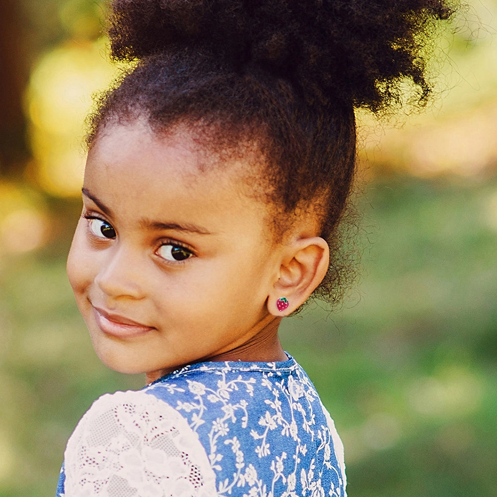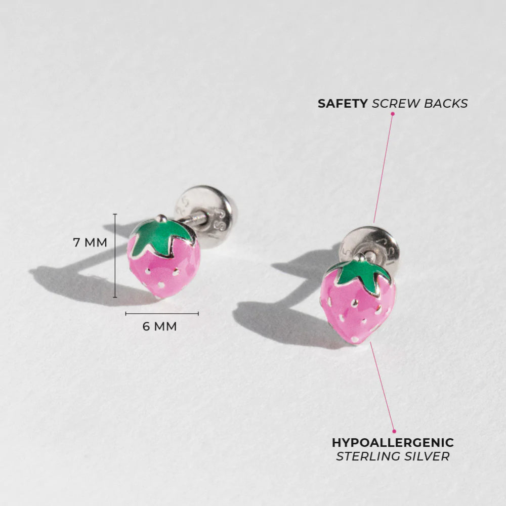 Make your little girl smile with these fun and adorable strawberry earrings! Entirely made of 925 sterling silver and hand painted with enamel colors. These strawberry earrings are perfect for little girls daily use. These cute earrings are hypoallergenic and suitable for children with sensitive ears. They feature threaded posts and a safety back system to ensure your child's earrings stay comfortably in place.