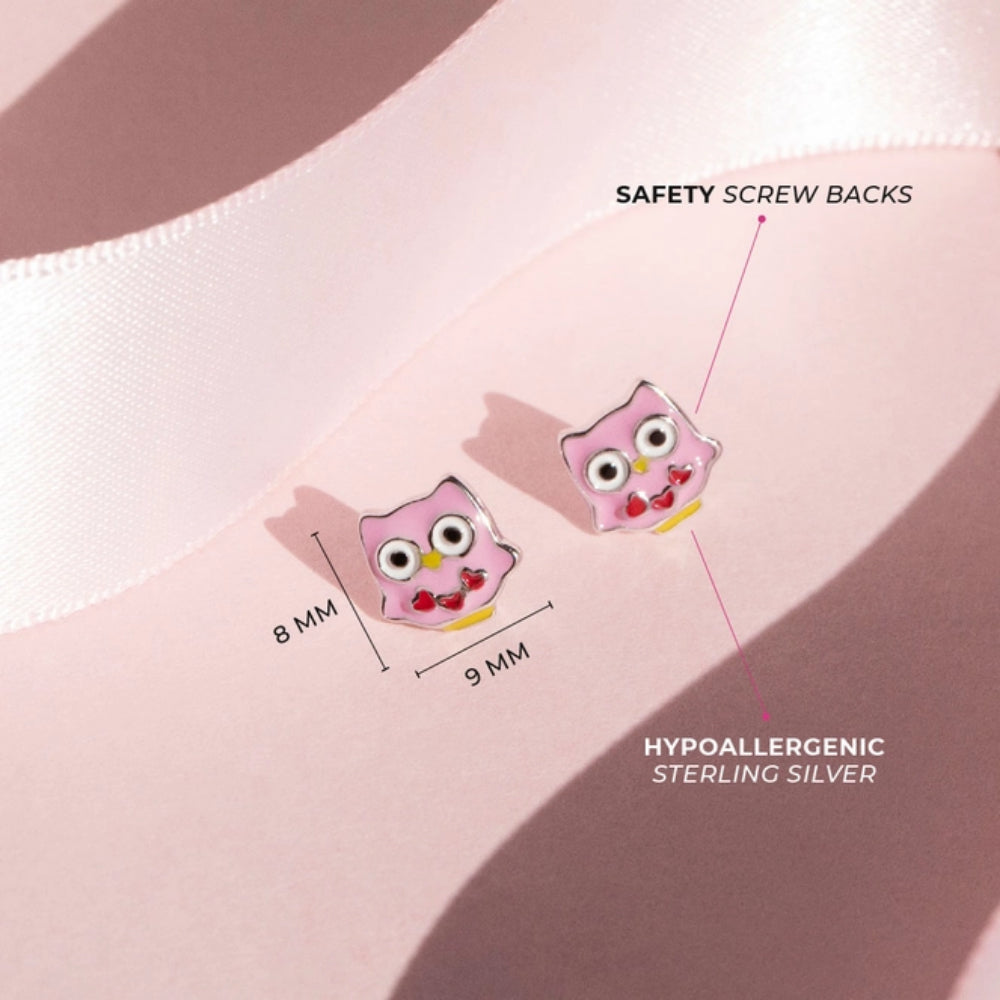 You'll love the compliments each time your little princess wears these whimsical owl enameled sterling silver earrings. A colorful and fun addition to their jewelry collection! These earrings are made of 925 sterling silver, making them naturally hypoallergenic and safe for sensitive ears. They feature threaded posts and a safety back system to ensure your child's earrings stay comfortably in place. A complimentary Window Box is included for easy gift giving!