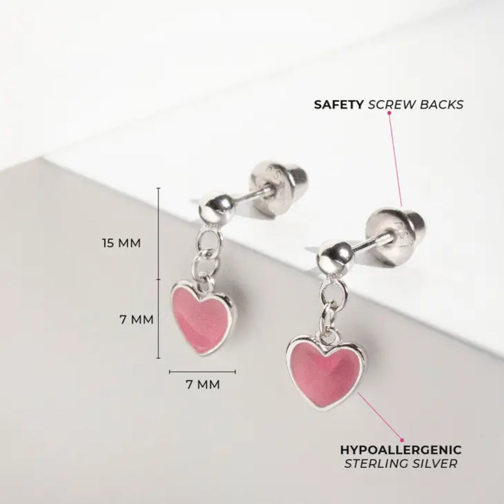 These sweet and simple pair of small dangle enamel heart earrings are perfect for everyday use, and even special occasions! Finely crafted in 925 sterling silver and enamel, they are hypoallergenic and safe for children with sensitive ears. They feature a threaded earring post and back to ensure your child's earrings stay safely and comfortably in place.