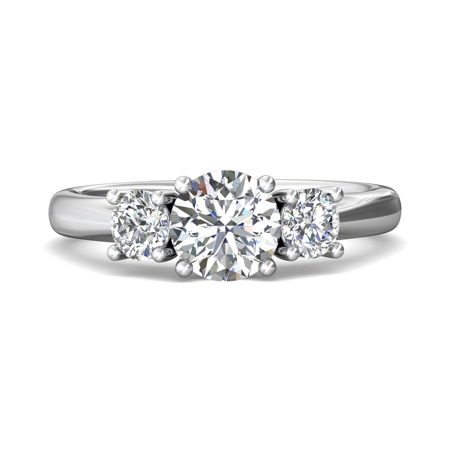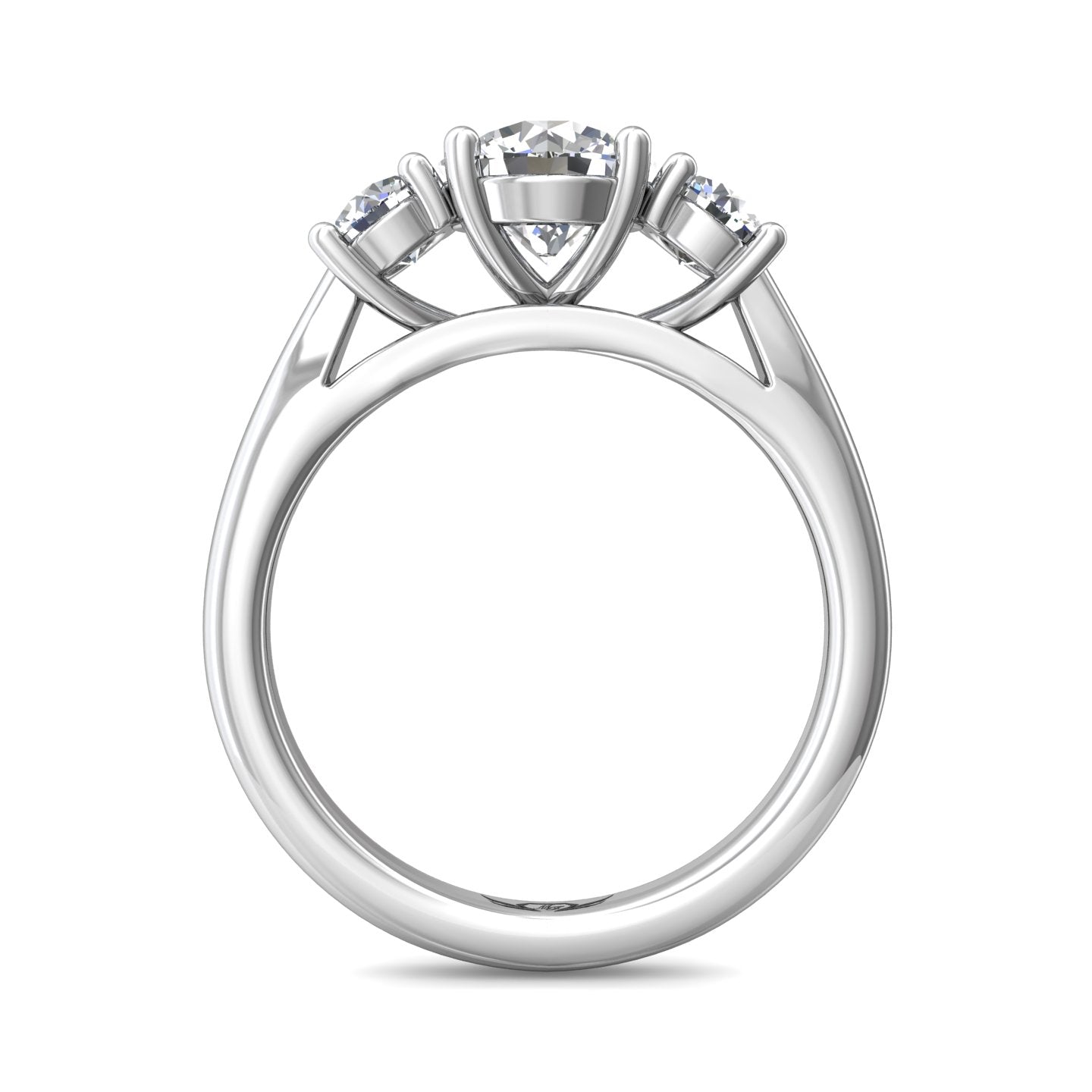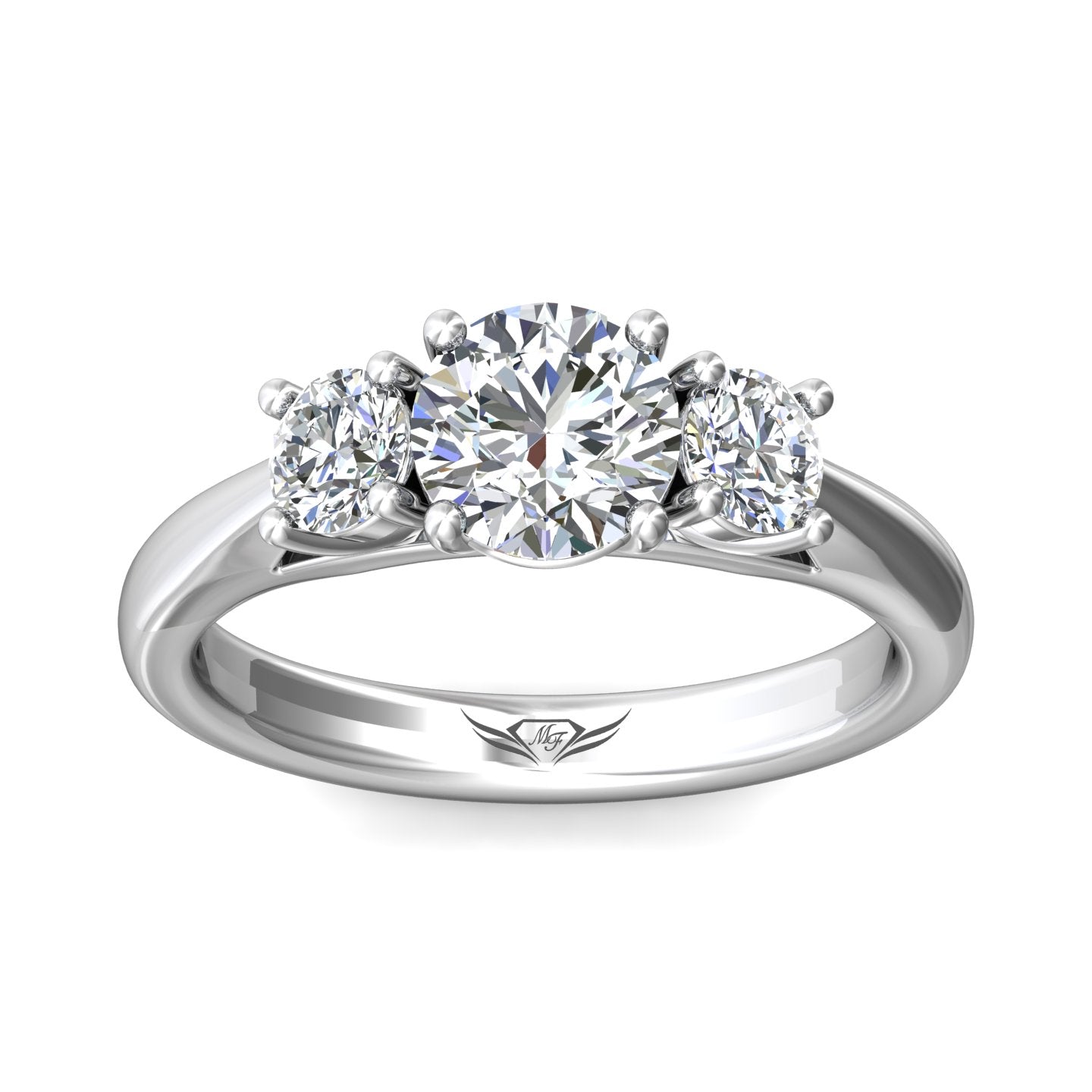 This classic three-stone FlyerFit engagement ring is perfectly crafted to hold your chosen side stones and center diamond.