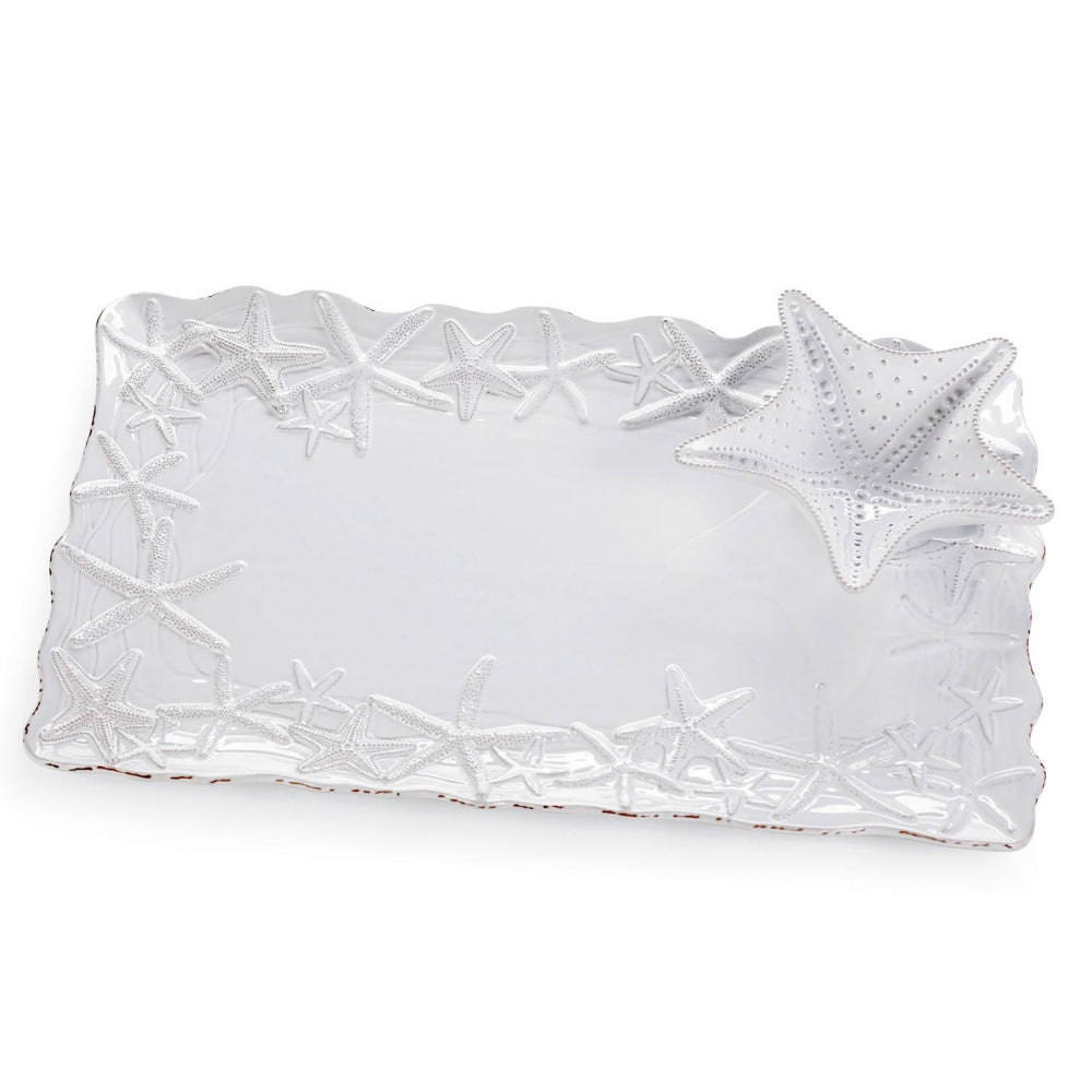 Terracotta dip set features intricate starfish details. Bowl is permanently attached.