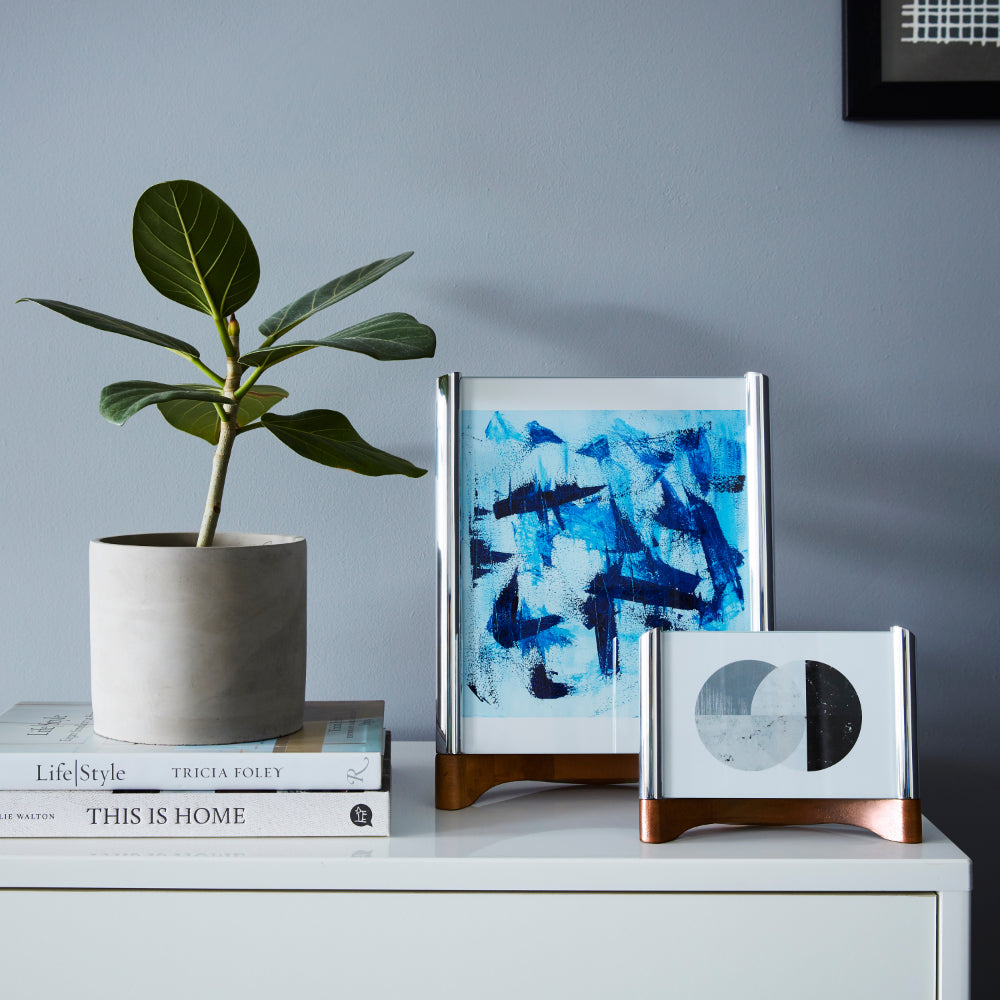 A striking combination of wood and metal, the Sky View Frame’s contemporary design displays a favorite photo suspended between two Alloy pillars that rest on a curved wood base. Set it on a side table or mantel to be admired.
