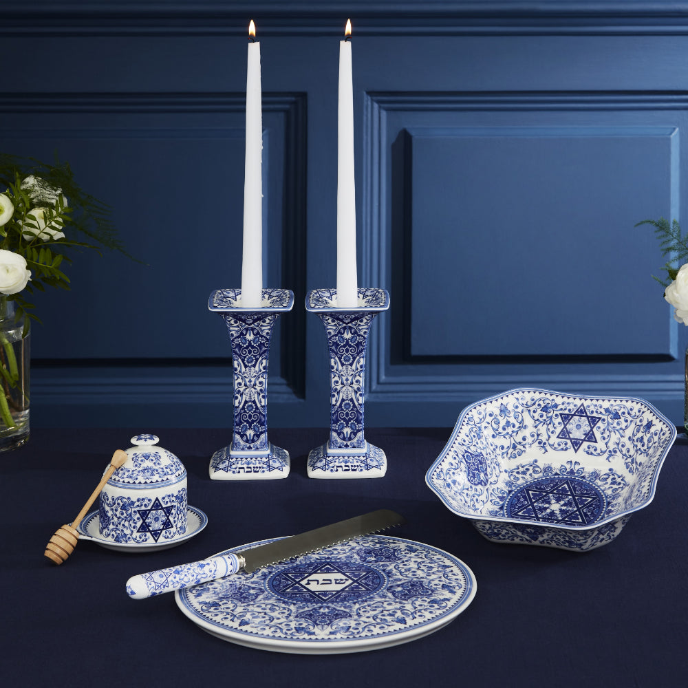 The Judaica Round Challah Tray is an elegantly designed serving tray to be used on the Sabbath to serve the Challah bread. The design on the Challah tray is based on historic Judaic manuscripts from the 1880's, influenced by early ceramic tile motifs in a traditional blue and white.The dominant motif consists of stylized flowers and vines, interwoven amongst the straight-edged Star of David. A classic tray for serving Challah, pair with our Challah Knife for an elegant wedding gift.