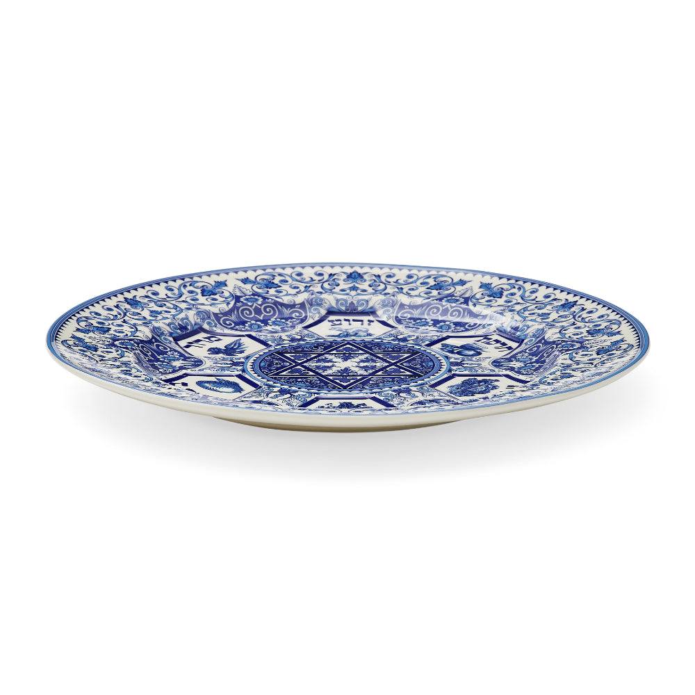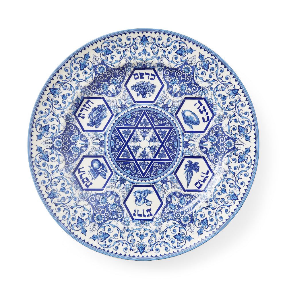 Celebrate Passover with our classic Seder Plate from the Judaica Collection.The dominant motif consists of stylized flowers and vines, with illustrations of each of the seder plate items and their names in a classic blue and white. The design is based on historic Judaic manuscripts from the 1880's and influenced by early ceramic tile motifs.