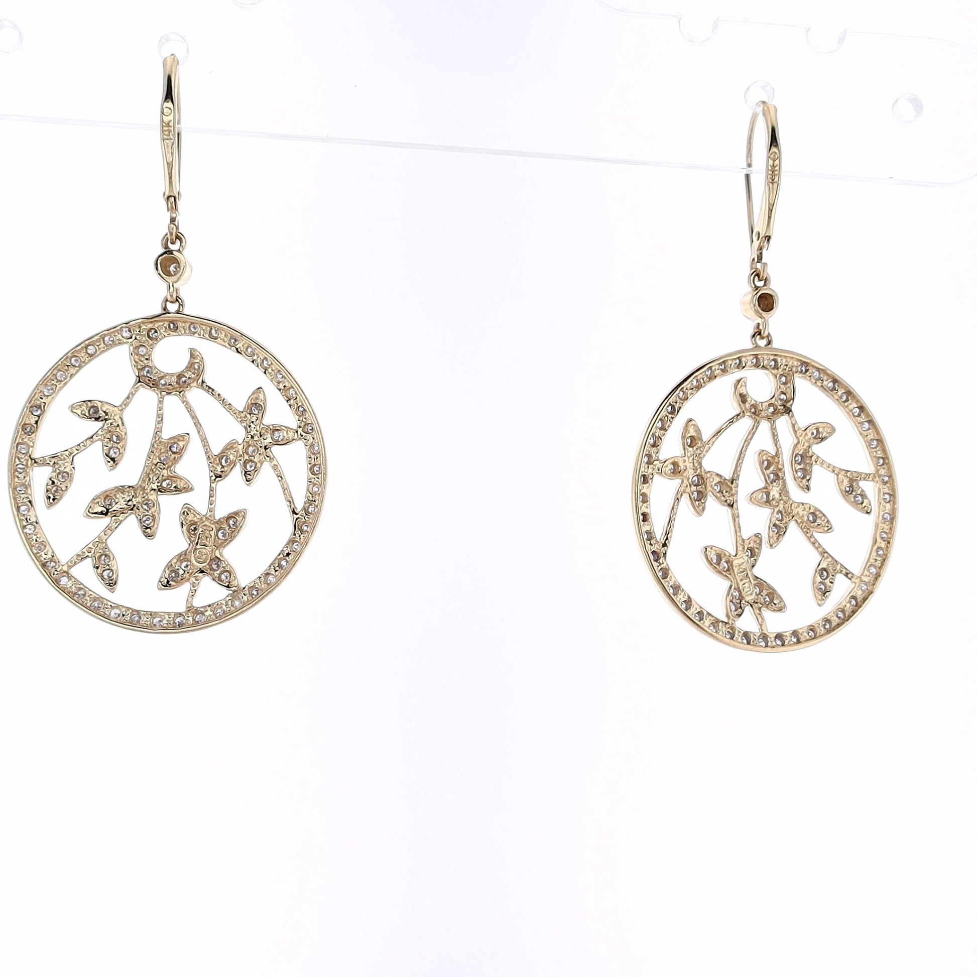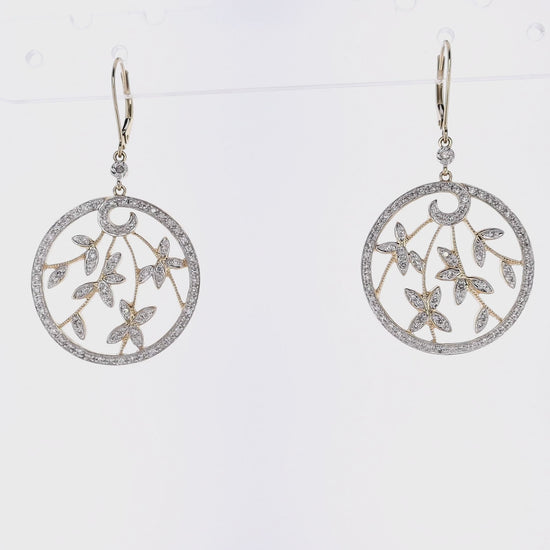 Estate 14 Karat Two-Tone Round Open Work Leaf Design Diamond Dangle Earrings