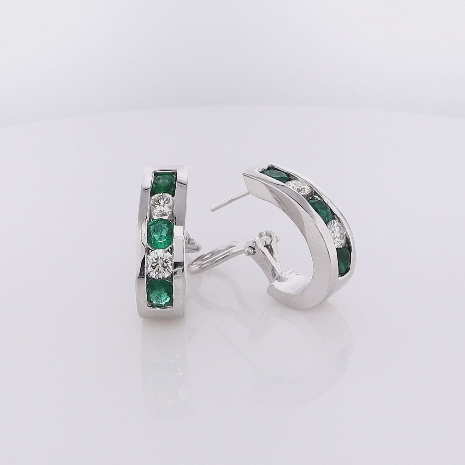 Estate 14 Karat White Gold Diamond and Emerald Omega Backed Hoop Earrings
