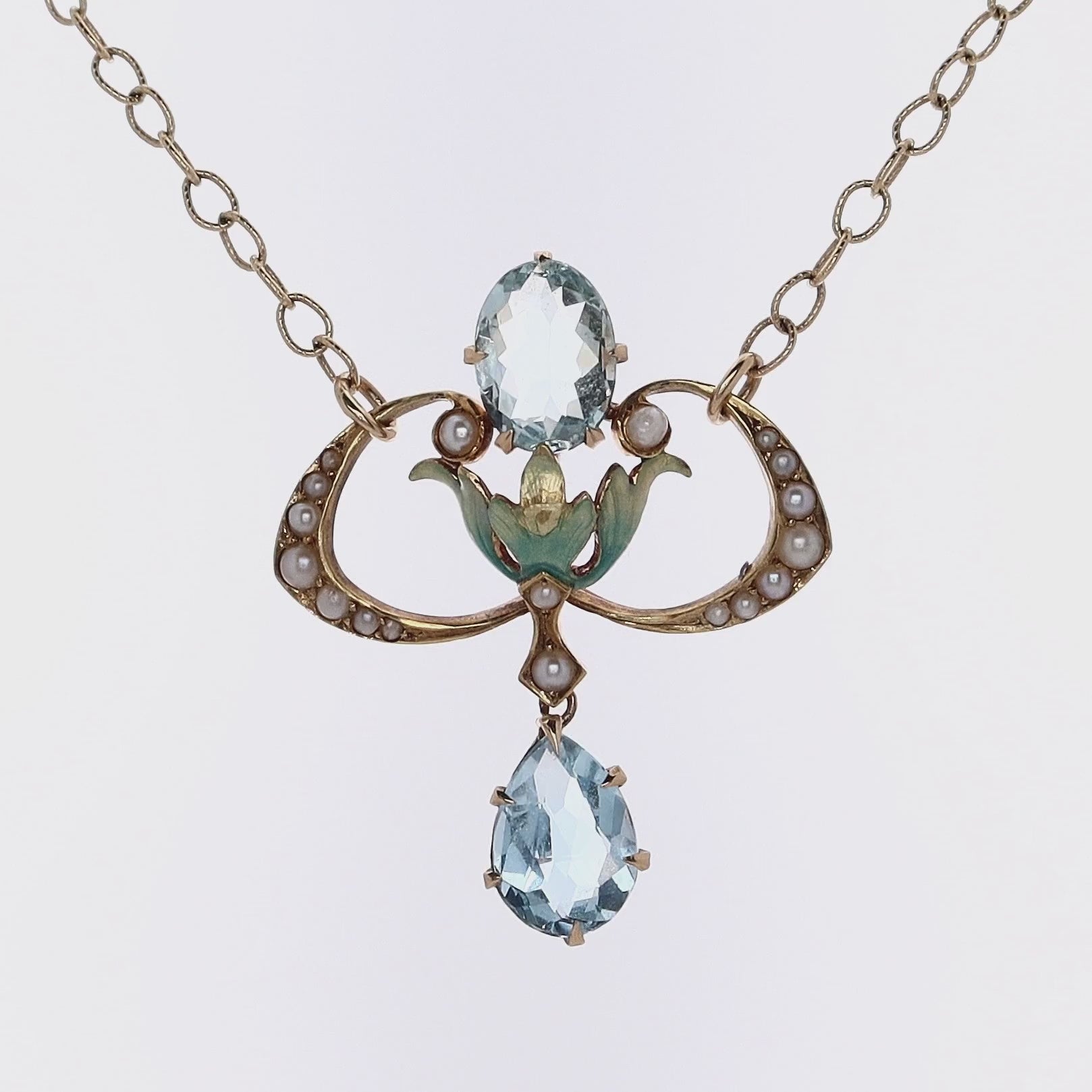 Estate 14 Karat Yellow Gold Aquamarine and Pearl Pendant Necklace