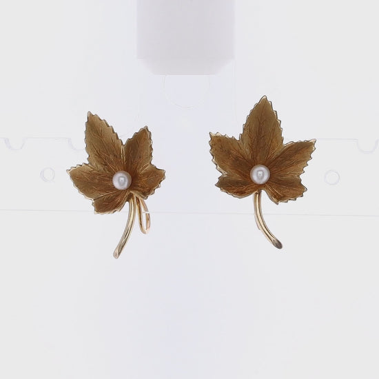 Estate 14 Karat Yellow Gold Earrings Maple Leaf Design Pearl Non-Pierced Earring