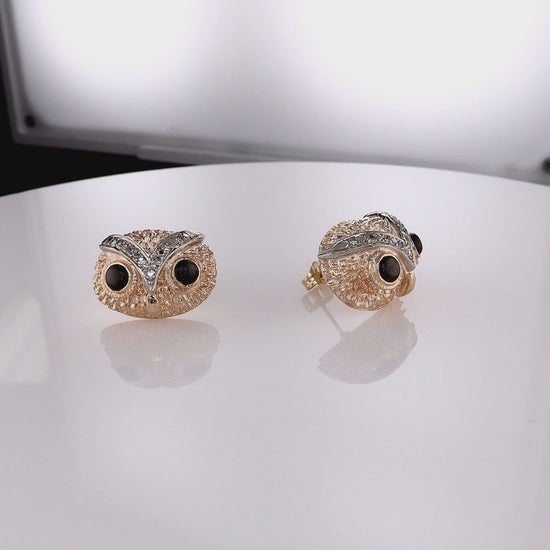 Estate 14k Two-Tone Owl Head Design Black Star Sapphire and Diamond Stud Earrings
