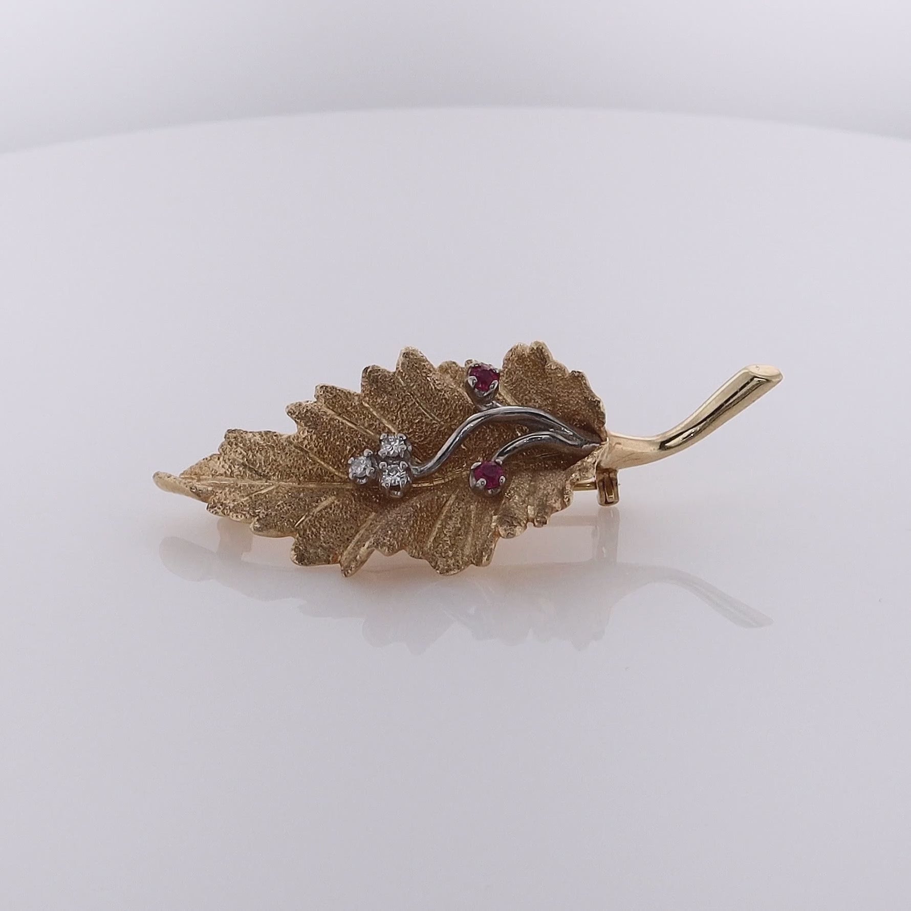Estate 14k Two Tone Ruby and Diamond Leaf Design Pin