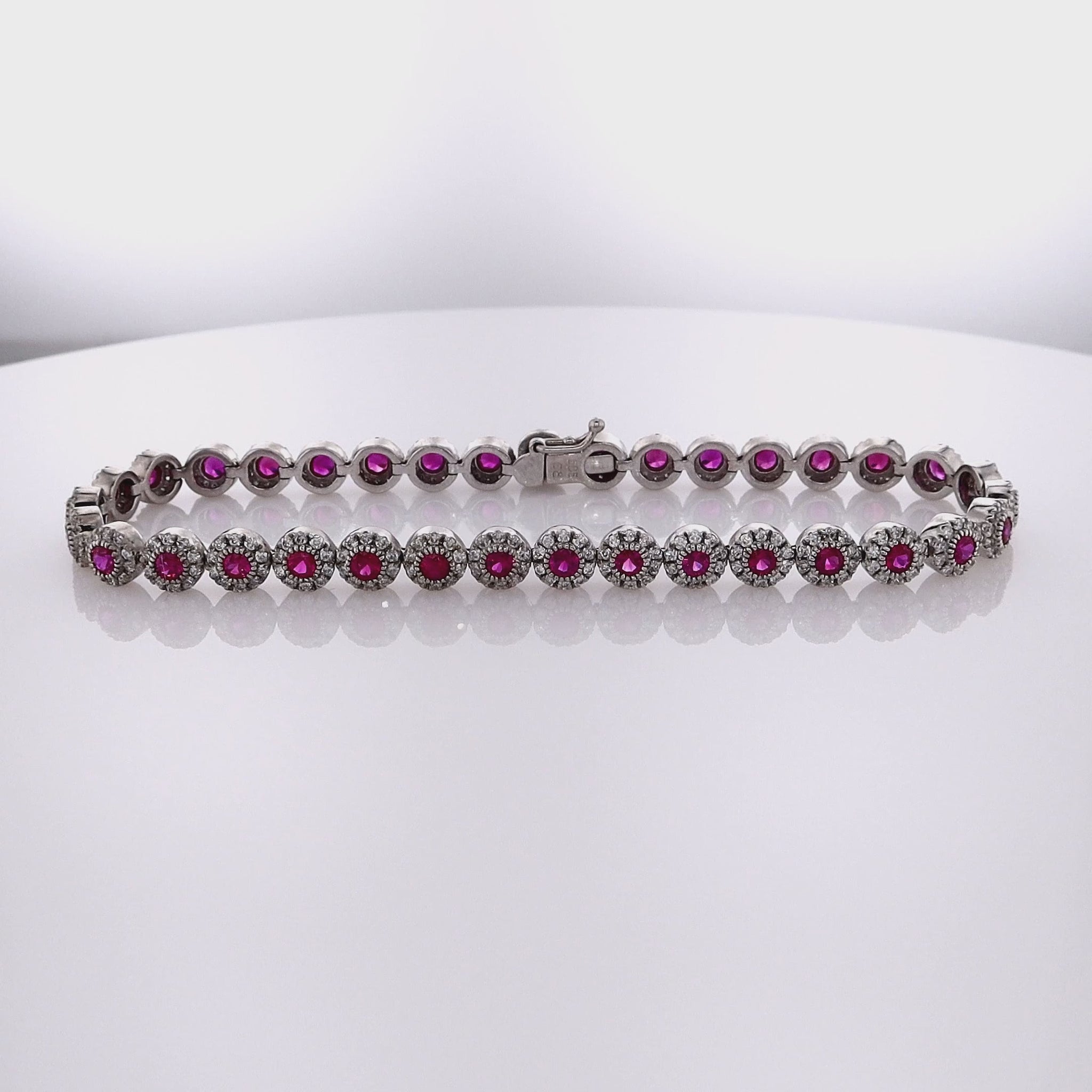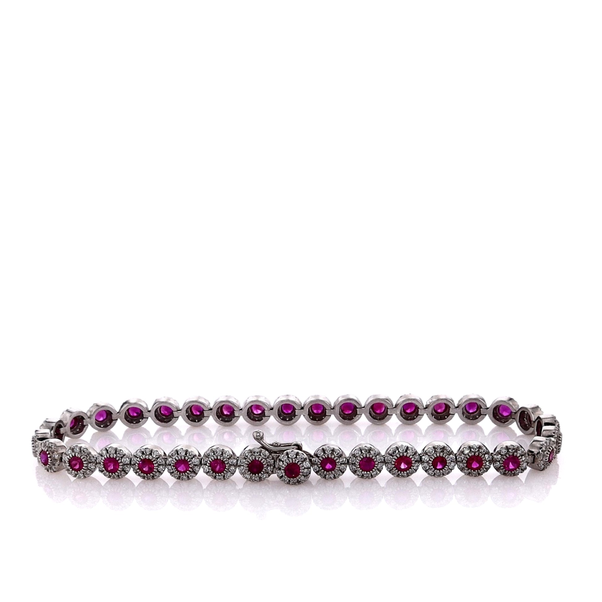 Estate 14k White Gold 7.25" Ruby and Diamond Halo Bracelet