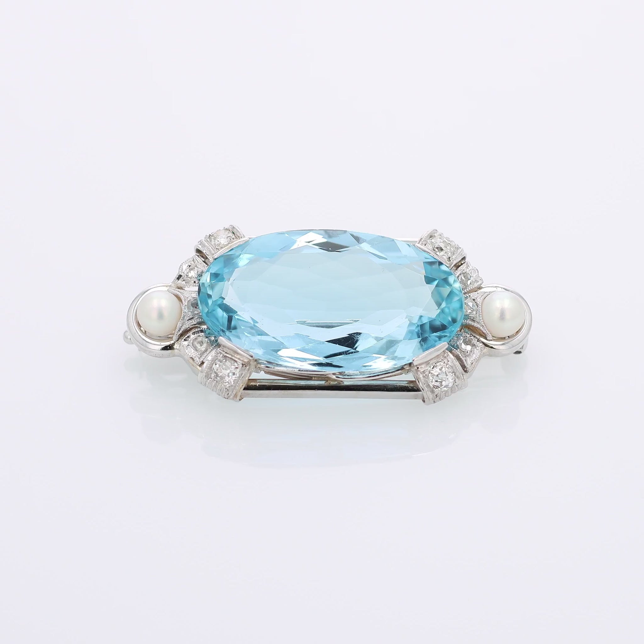 Estate 14k White Gold Oval Aquamarine, Pearl and Diamond Pin