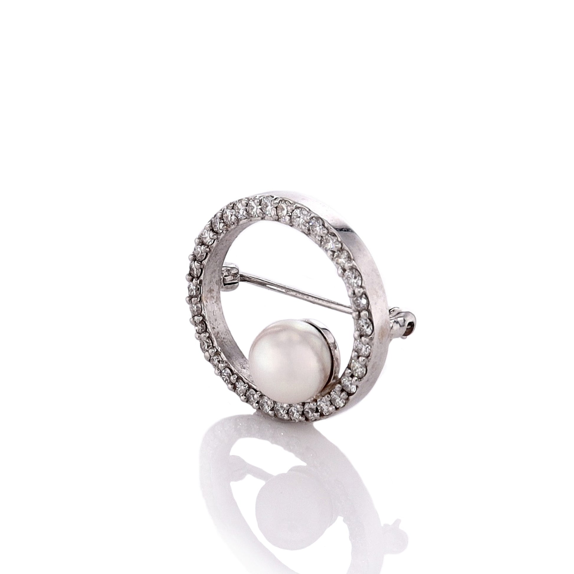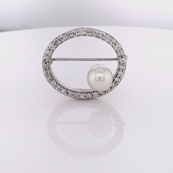 Estate 14k White Gold Oval Design Pearl and Diamond Pin