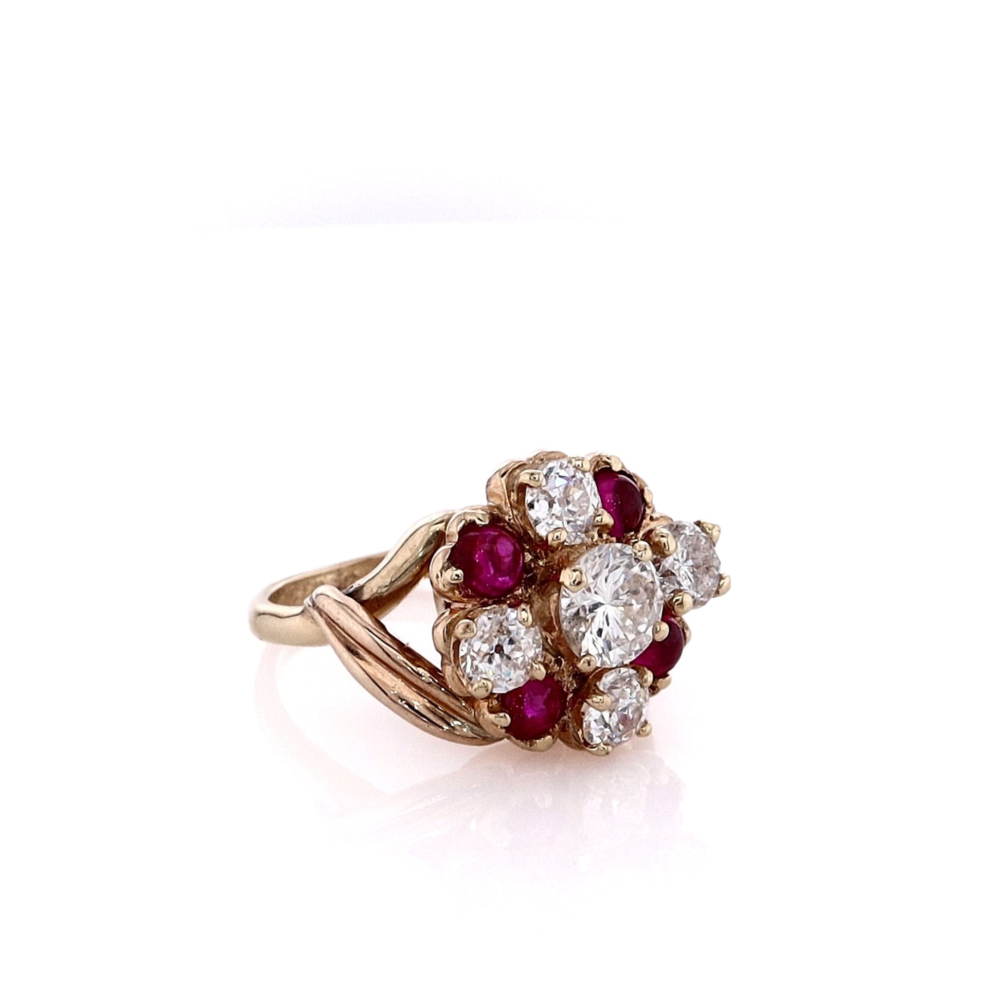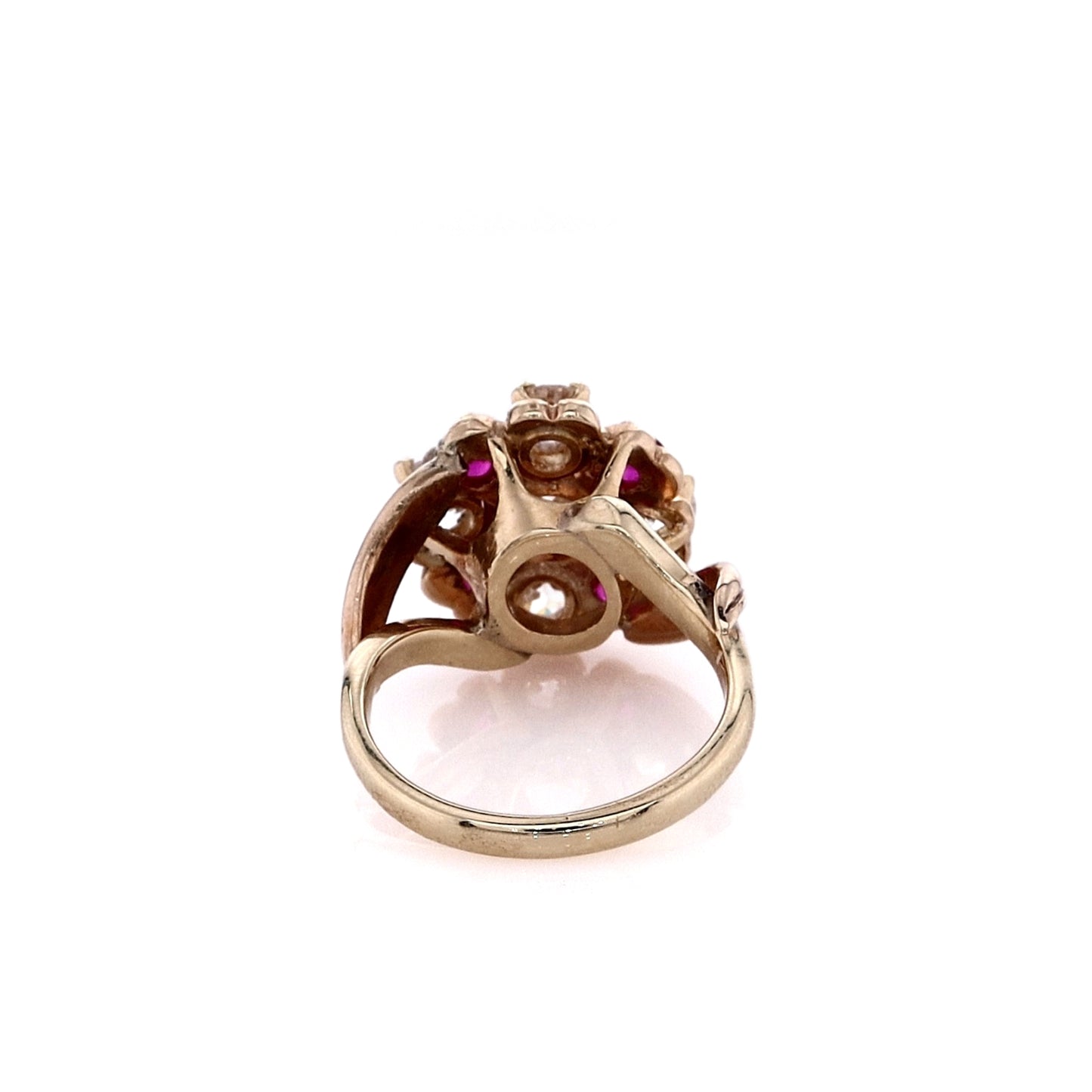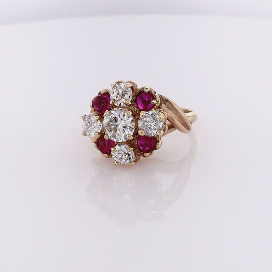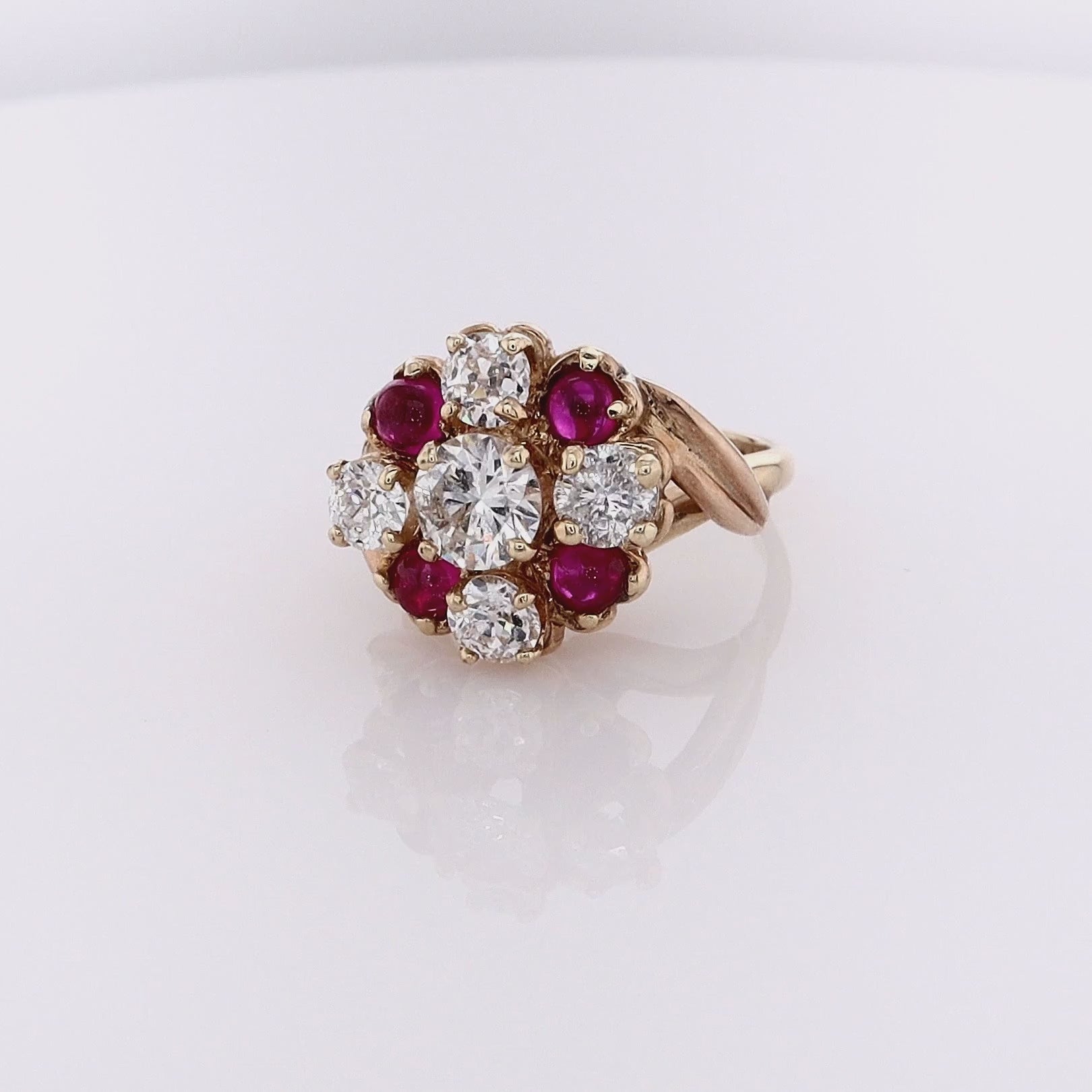 Estate 14k Yellow Gold Cabochon Rubies Round Brilliant Cut and Old European Cut Diamond Ring