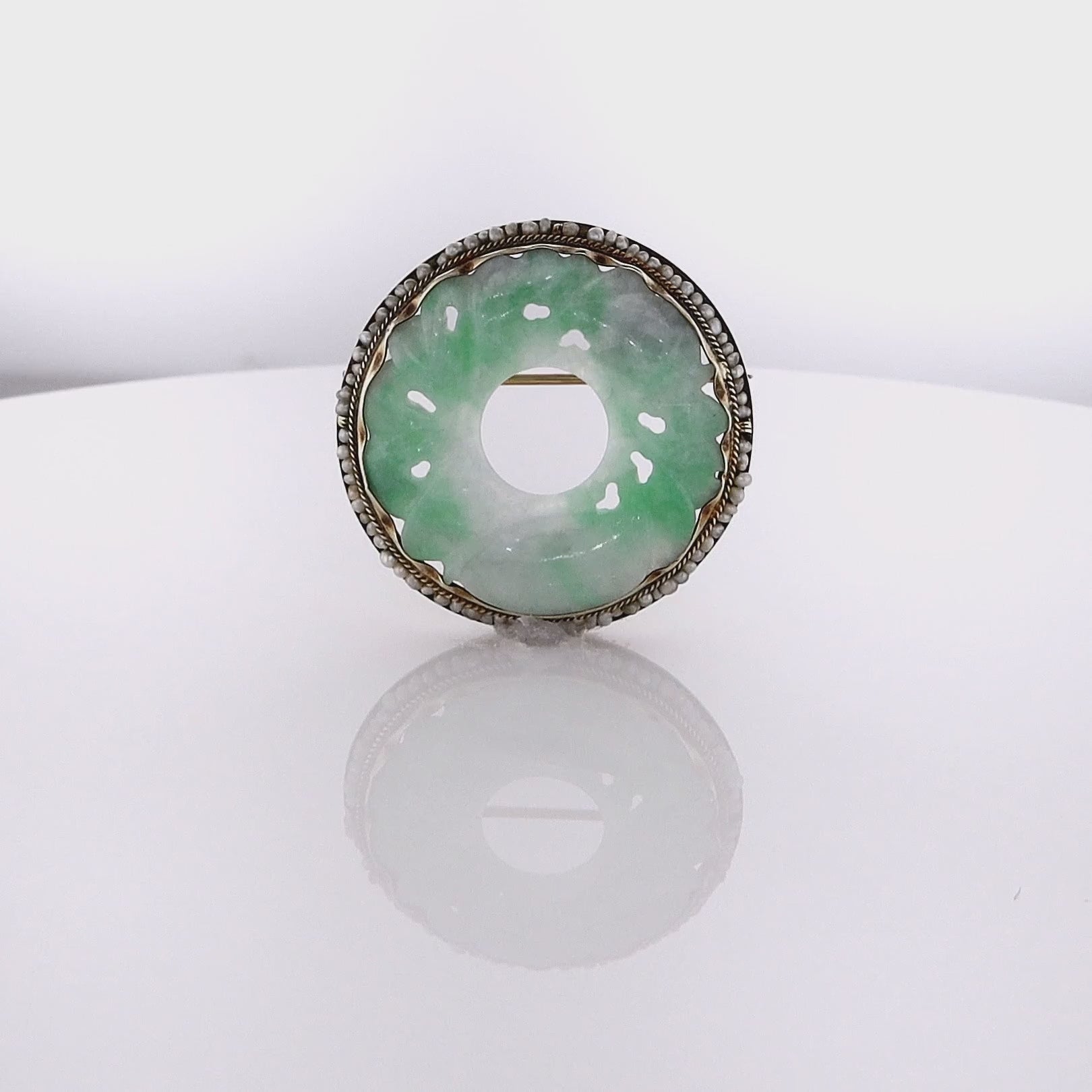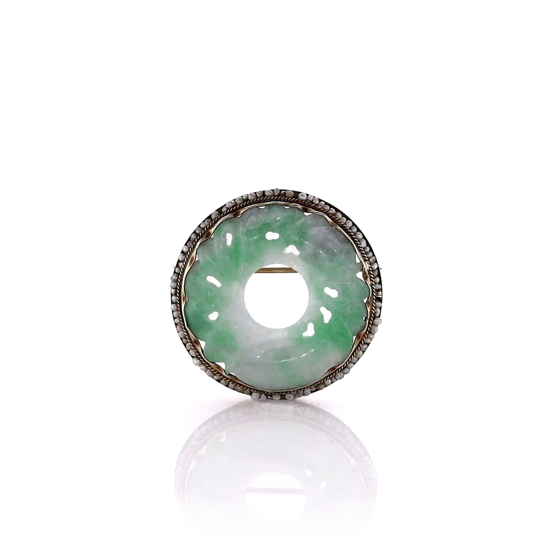 Estate 14k Yellow Gold Green Circle Carved Jadeite and Seed Pearl Pin