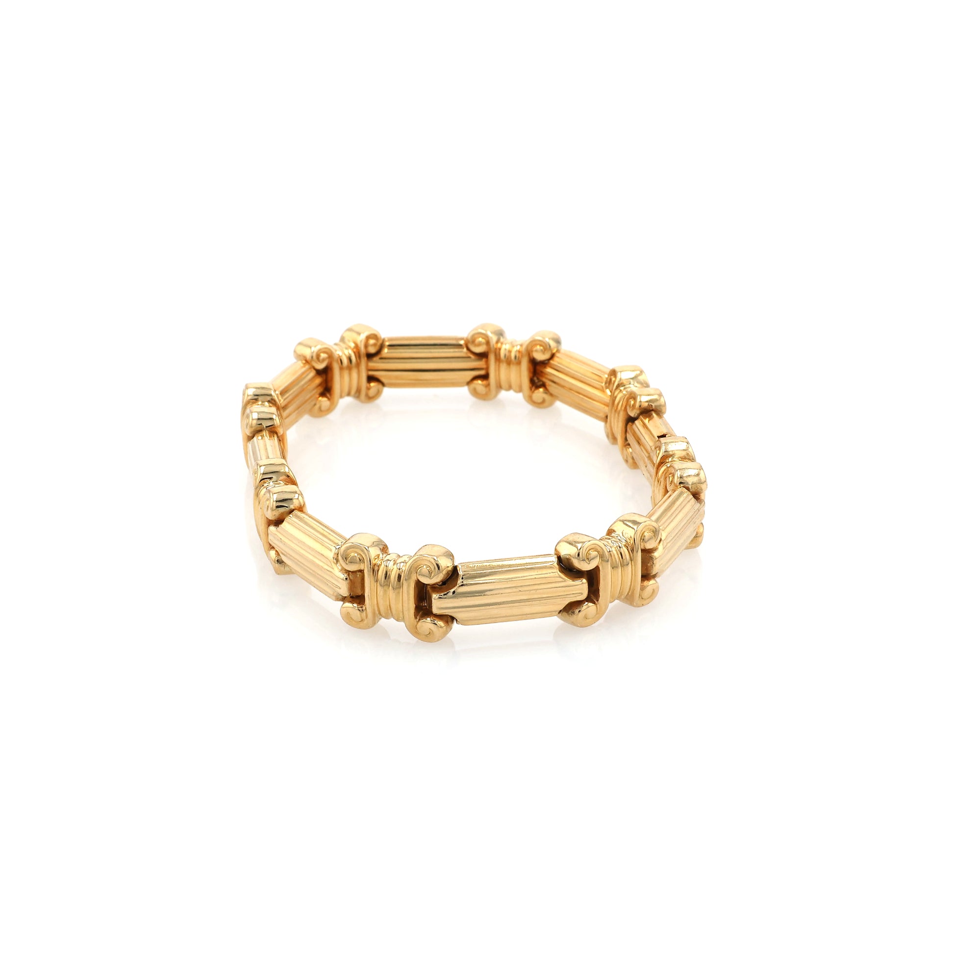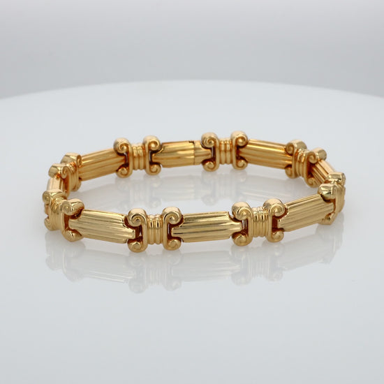 Estate 18 Karat Yellow Gold Alternating Ribbed Bar and Scroll Square Design Bracelet With Hidden Box Clasp