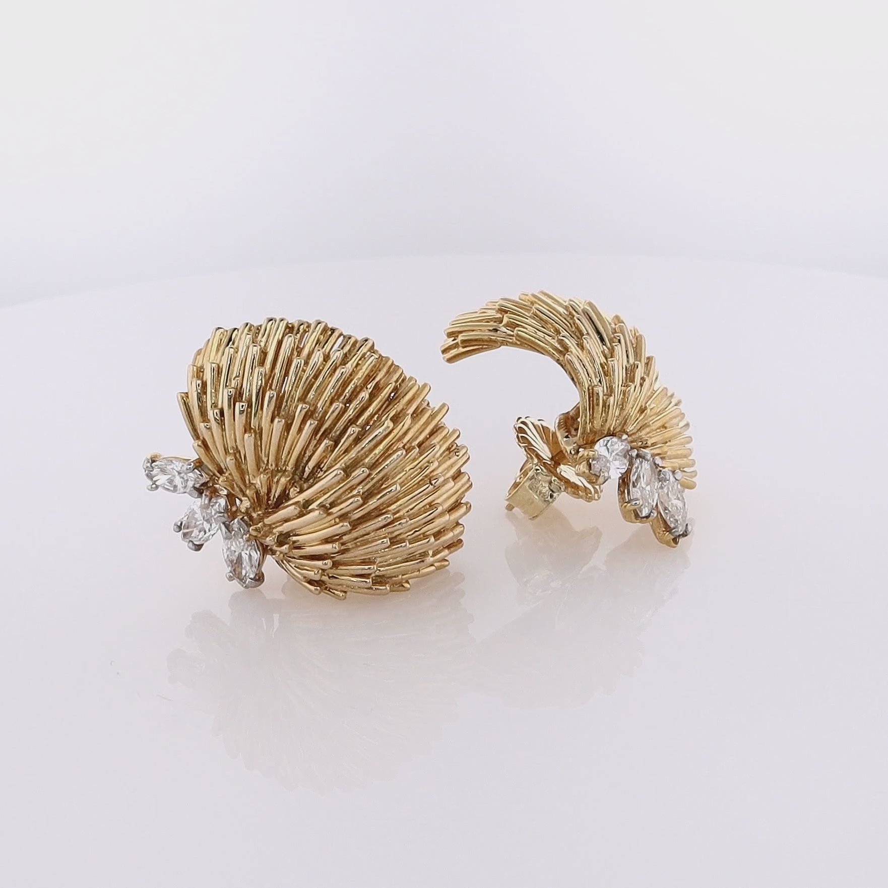 Estate 18 Karat Yellow Gold Textured Fan Design Diamond Earrings