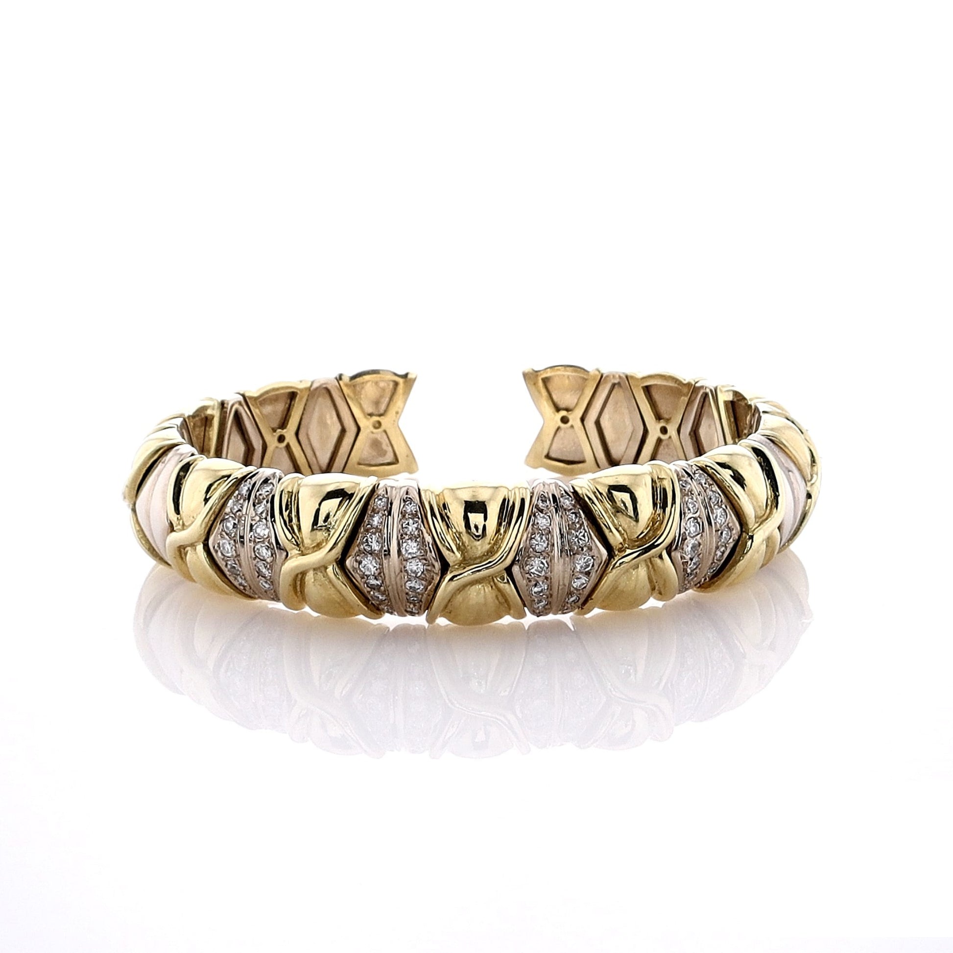 Estate 18k Two Tone Gold Flexible Diamond 13mm Wide Cuff Bracelet