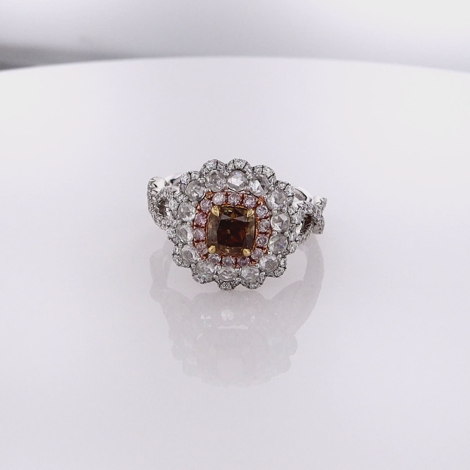 Diamonds: 1 Cushion Cut Brown Center Diamond (0.72ct Total Weight,) 14 Pink Round Brilliant Cut Diamonds (0.14ct Total Weight,) 156 Round Brilliant Cut Diamonds (0.82ct Total Weight,) and 14 Rose Cut Diamonds