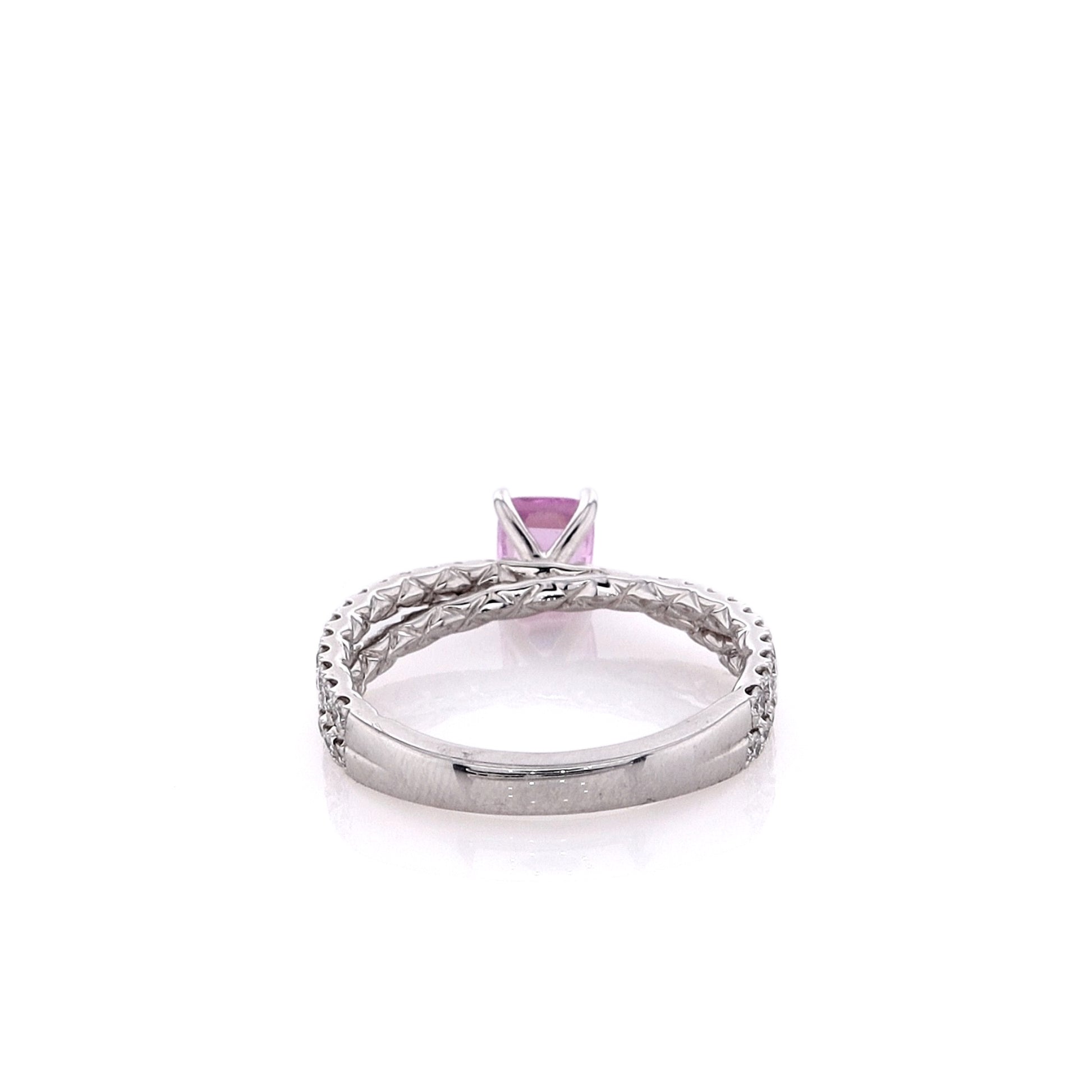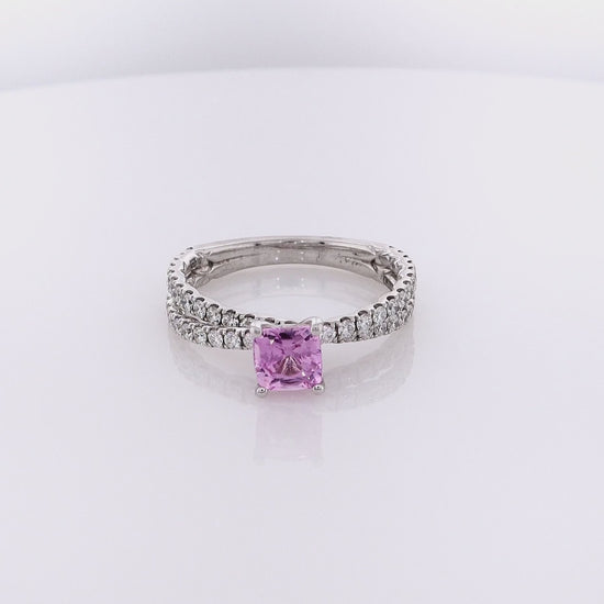 Estate 18k White Gold Cushion Pink Sapphire and Diamond Crossover Shank Ring