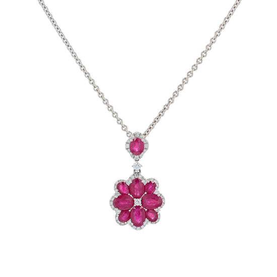 Estate 18k White Gold Flower Design Ruby and Diamond Halo Pendant Necklace