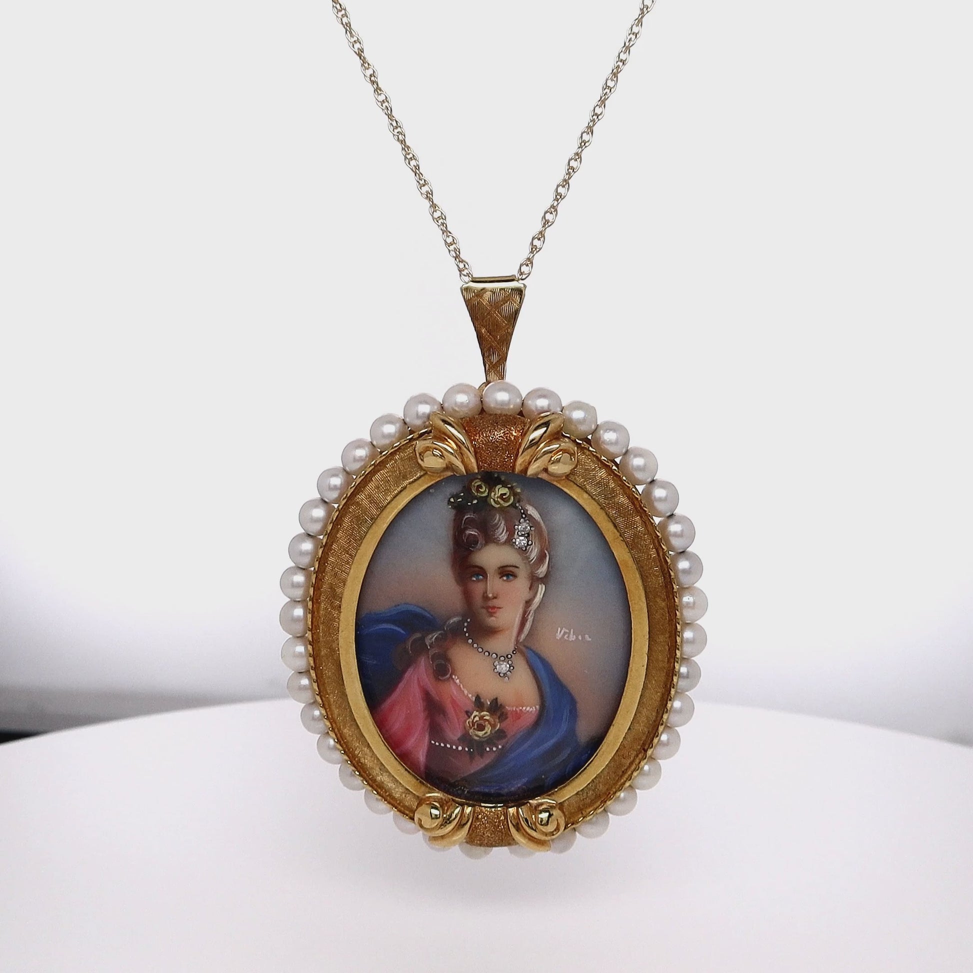 Estate 18k Yellow Gold Vintage Oval Miniature Painting Pearl Pin & Pendant *No Chain*