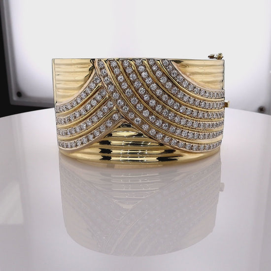Estate 18k Yellow Gold Wide Ribbed "V" Design Diamond Bangle Bracelet
