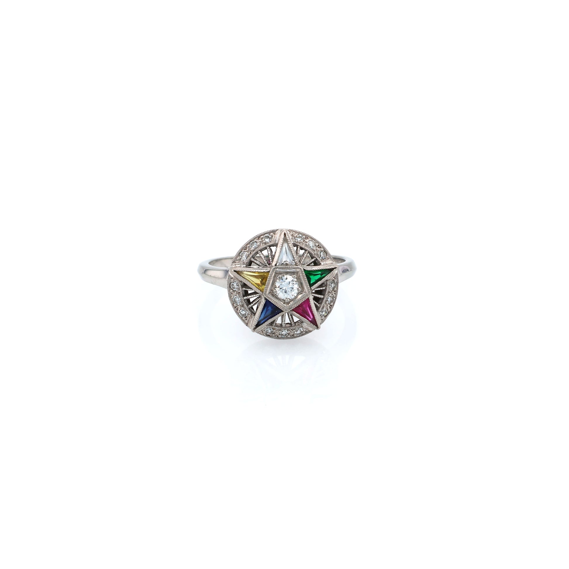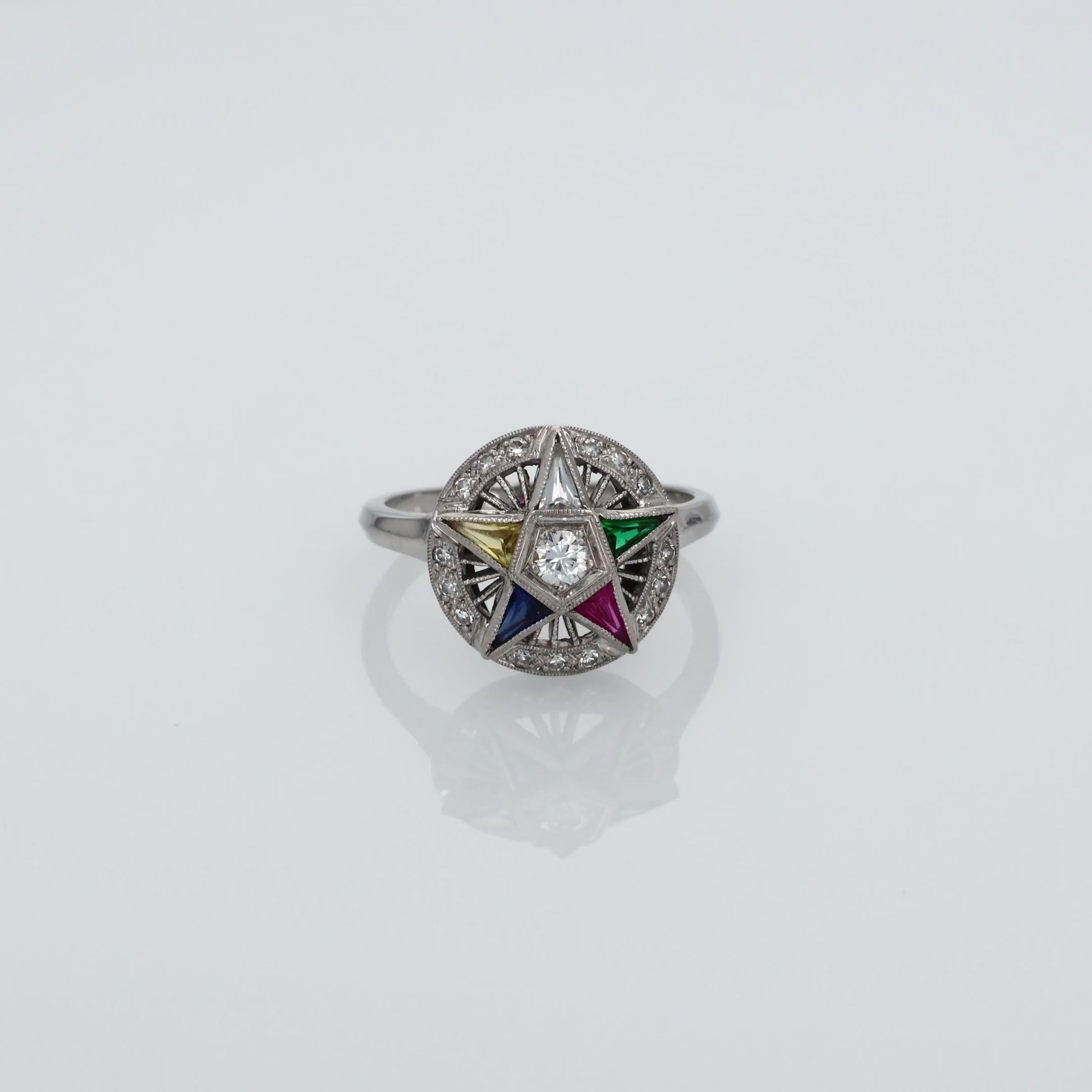 Estate Jabel 18 Karat White Gold Diamond and Stimulant Order of the Eastern Star Ring