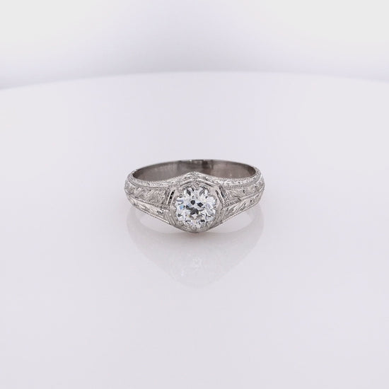 Estate Platinum Old European Cut Diamonds 8 Prong Belcher Style Hand Engraved Ring