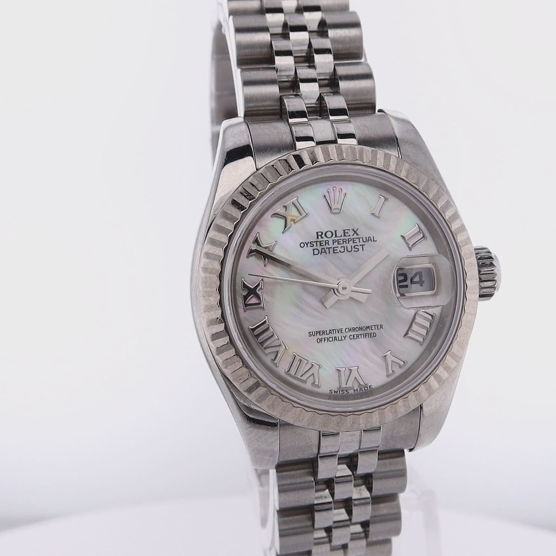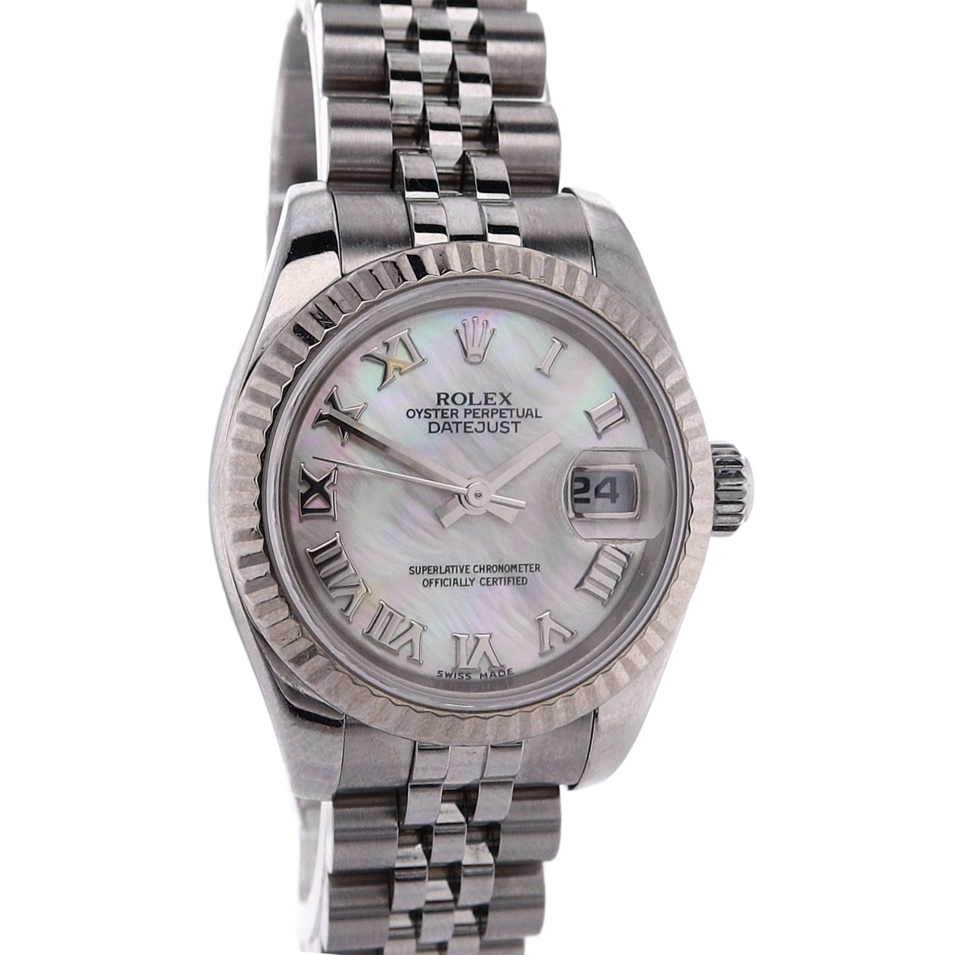 Estate Rolex Stainless Steel And 18 Karat White Gold OPDJ Mother of Pearl Roman Dial 179174 W/Box and Papers C.2007
