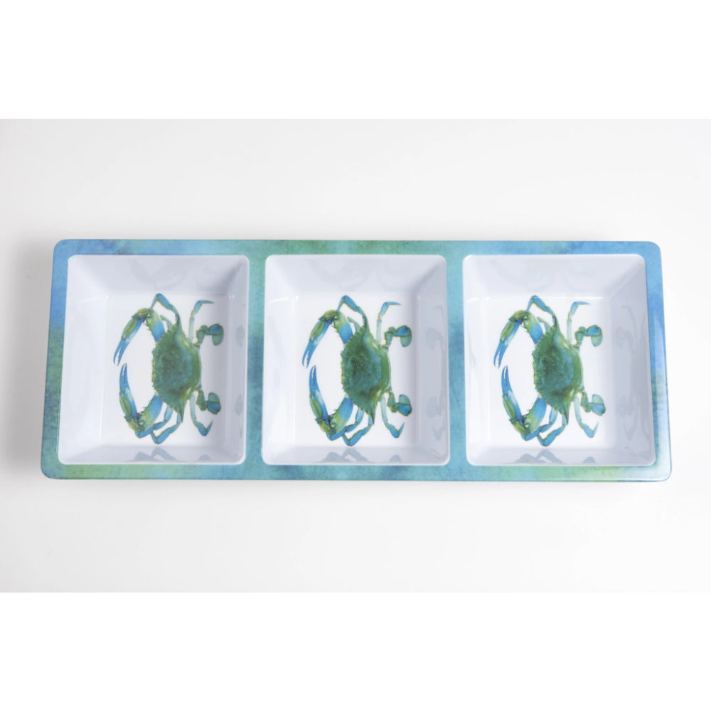 Each melamine tray has three images of the iconic Blue Crab and has three compartments to separate dips, nuts and chips.