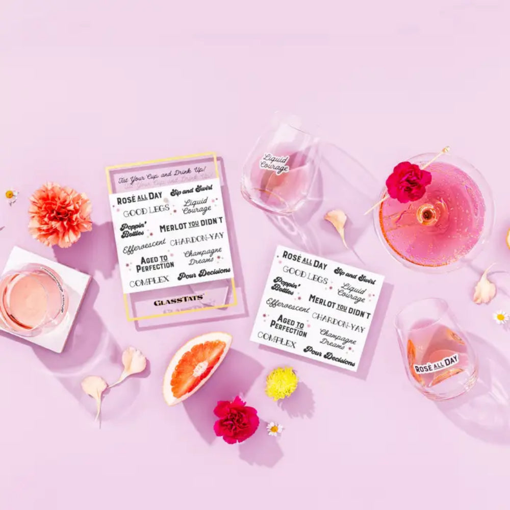 - 2 Sets of Wine Time Collection GlassTats: Each set includes 12 unique, dissolvable drink markers featuring fun and flirty designs. Keep track of your glass while adding a touch of personality to your party.