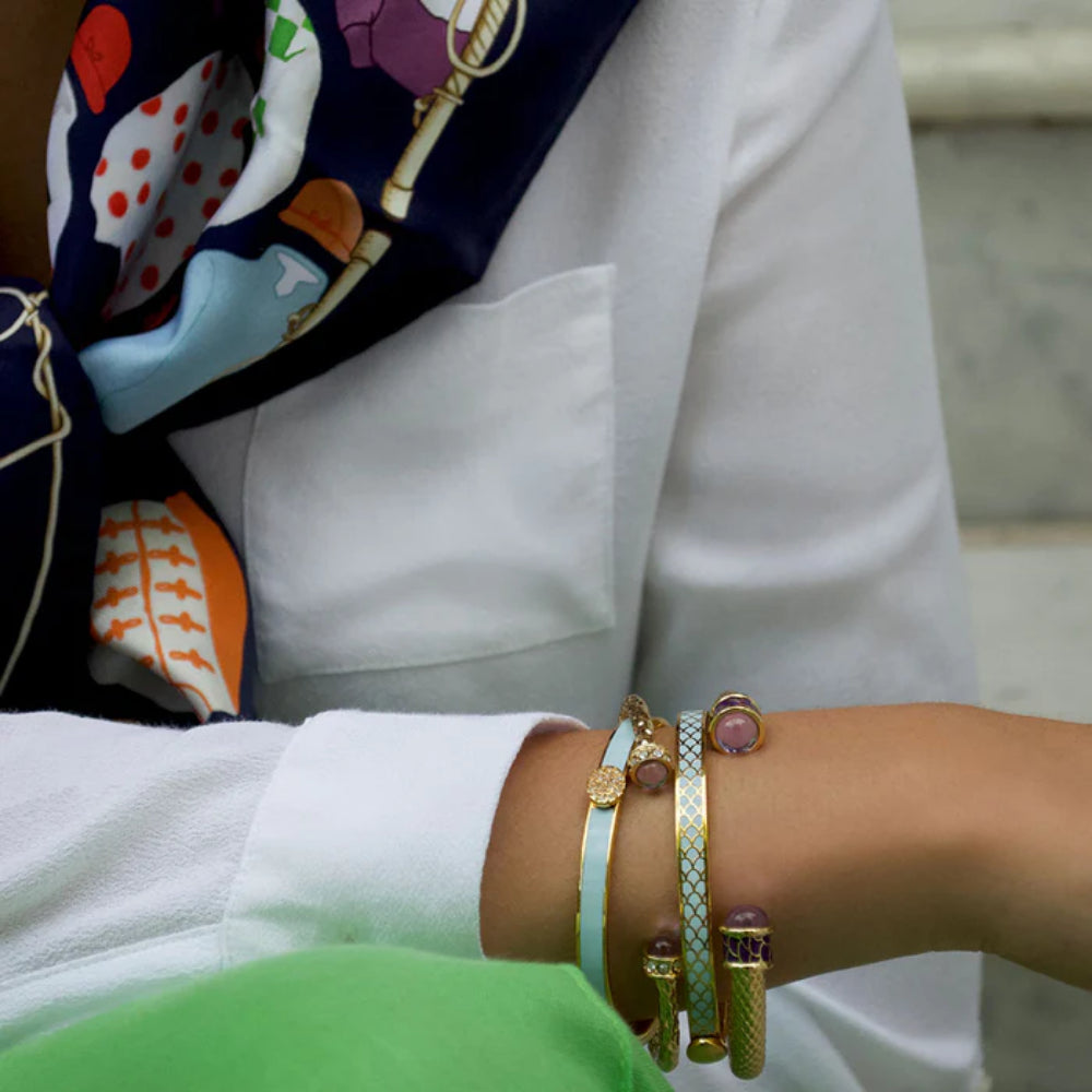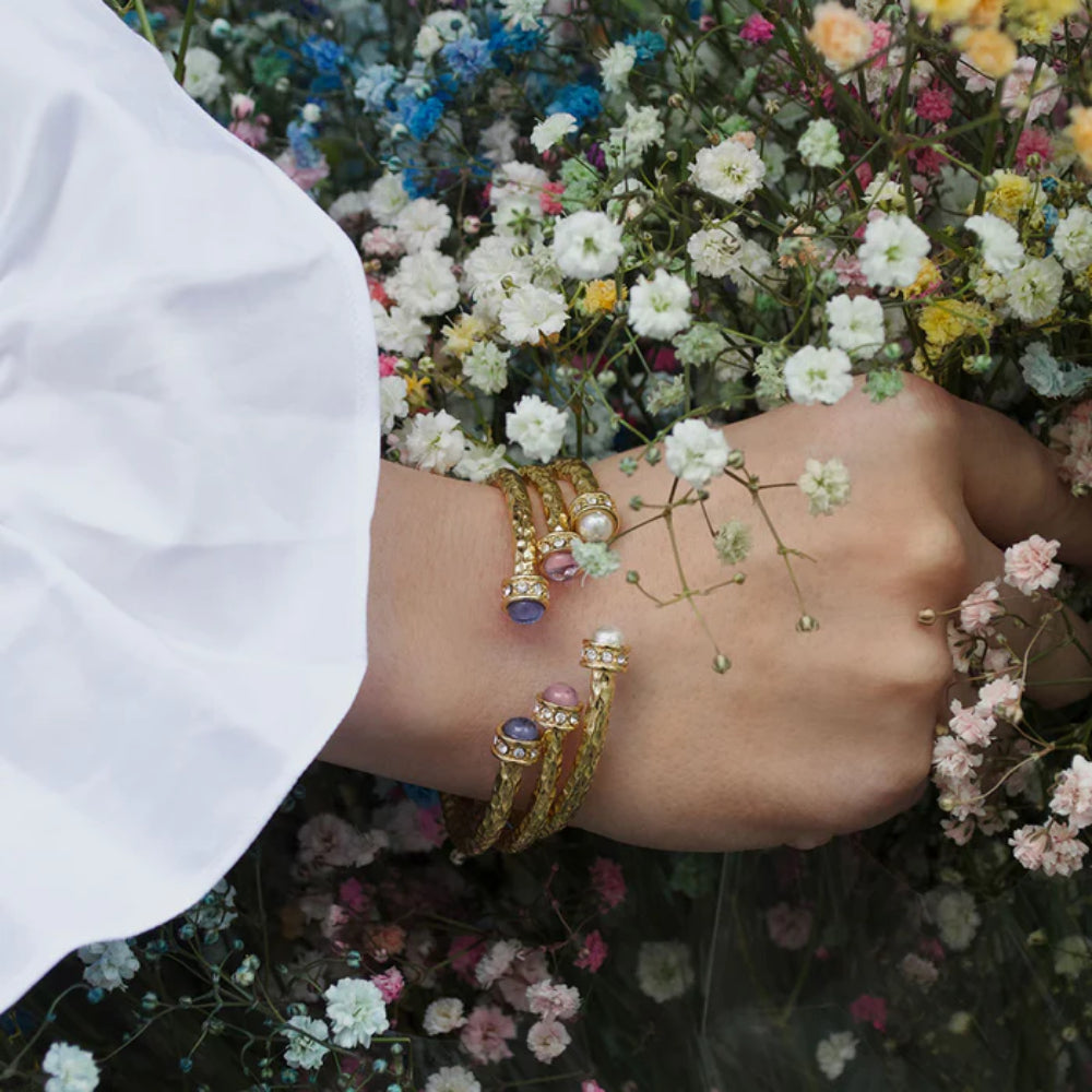 This Hammered Torque bangle boasts an eye-catching, contemporary silhouette. Either end is adorned with glass cabochons.