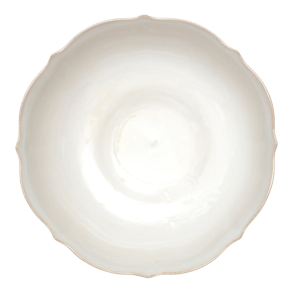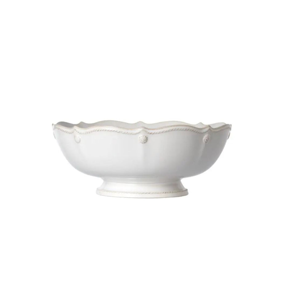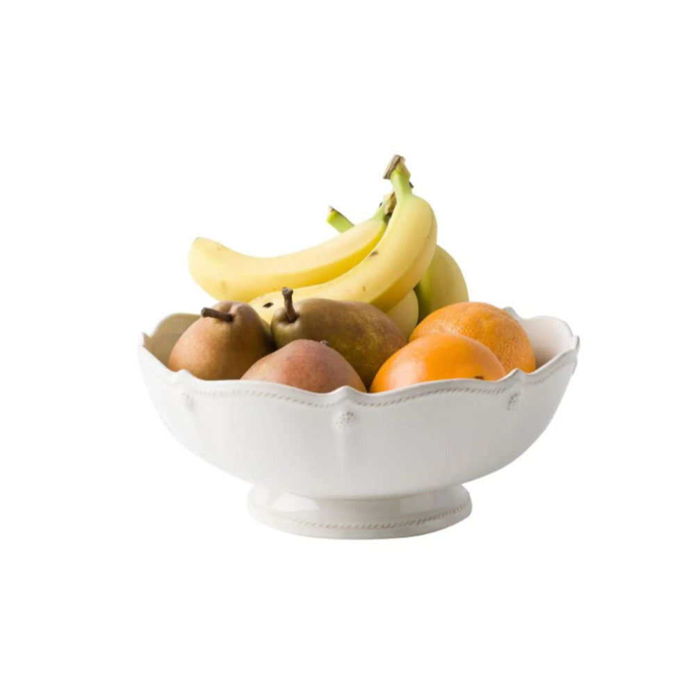 From the Berry & Thread Collection - Whether used as a centerpiece or a serving piece, our footed fruit bowl makes the perfect statement. Timeless in white, its scalloped edge and signature berry and thread motif provide a subtle backdrop for the contents within.