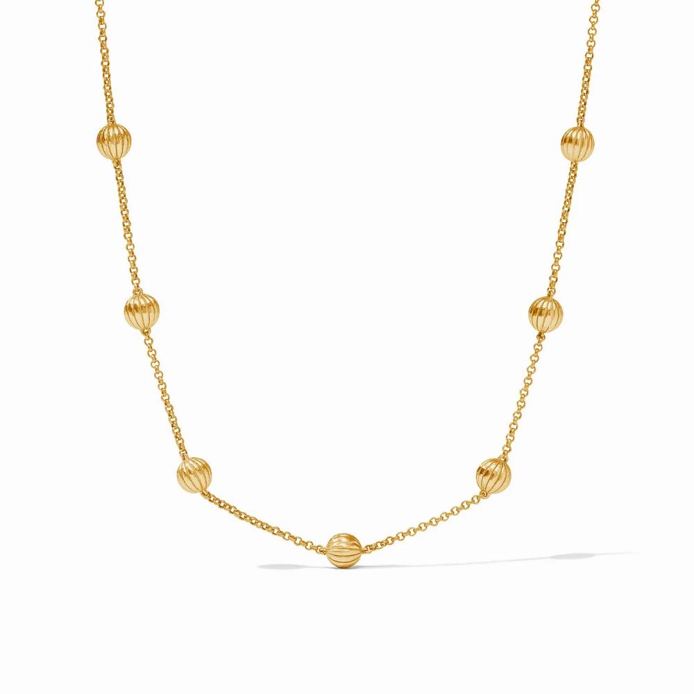 Petite, fluted golden spheres with lightly hammered texture, joined with delicate rolo chain.