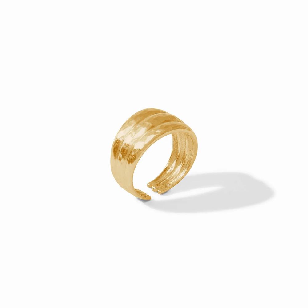 A fluted ring crafted from three softly tapering golden bands with a lightly hammered finish.