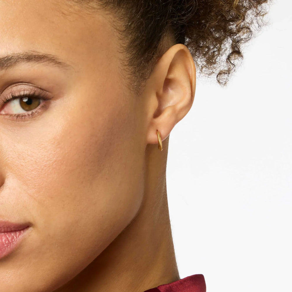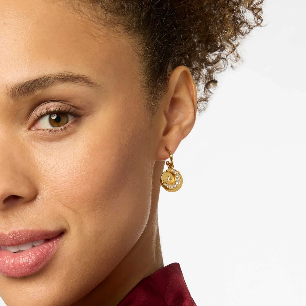 Create your own night sky with these earrings' charms—one a crescent moon adorned with graduated pavé, the other a golden disc engraved with stars, a moon, and a glittering gemstone.