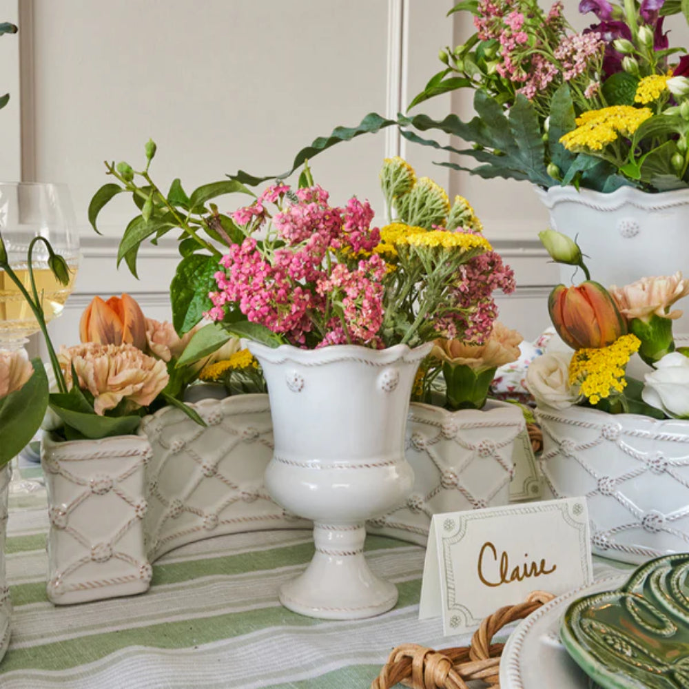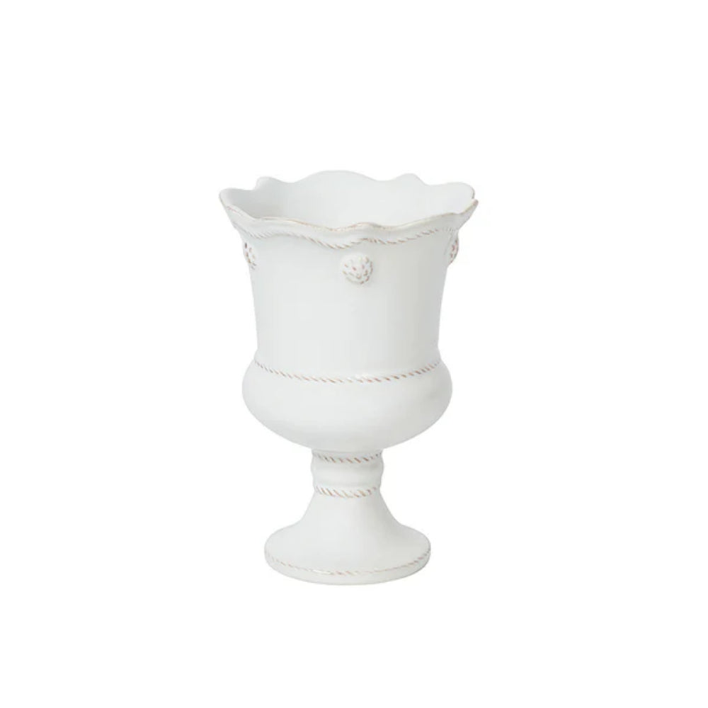 Put those gorgeous blooms on a pedestal, where they belong. Trimmed with our iconic Berry & Thread motif and gleaming with our signature whitewash glaze, this classic vase is your go-to, versatile vessel for everything—from wildflowers on your desk to garden roses for brunch. Use alone or in combination with our other parterre sculptural pieces to create your own fantasy tabletop garden. Lovely for fresh arrangements or small potted plants.