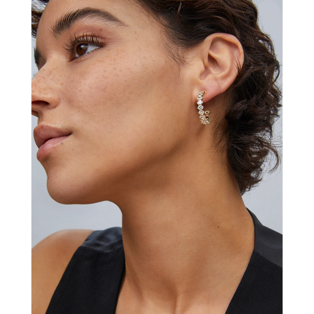 Anchor your ear party with the Cailin Gold or Silver Crystal Hoop Earrings in White Crystal. Featuring an elegant single row of crystals, youll be the center of attention in these stunning statement hoops.