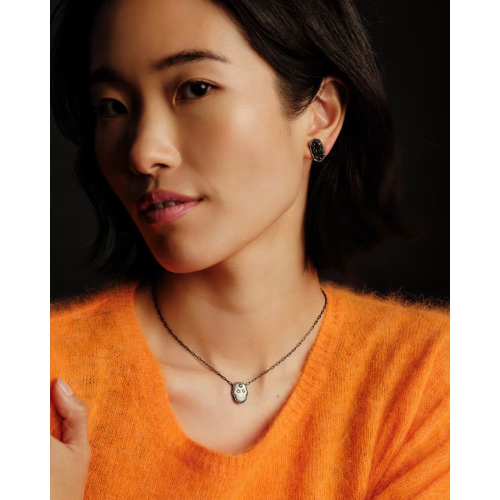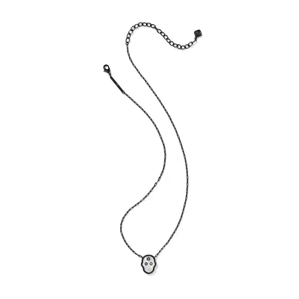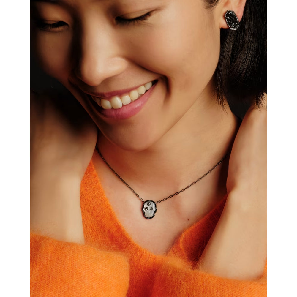 Frighteningly fashionable, the Skeleton Gunmetal Short Pendant Necklace will put the spirit in your Halloween fits. A shimmering mother-of-pearl skull is framed by our signature hoofprint detailing, creating a seasonal style that’s so KS, it’s spooky.