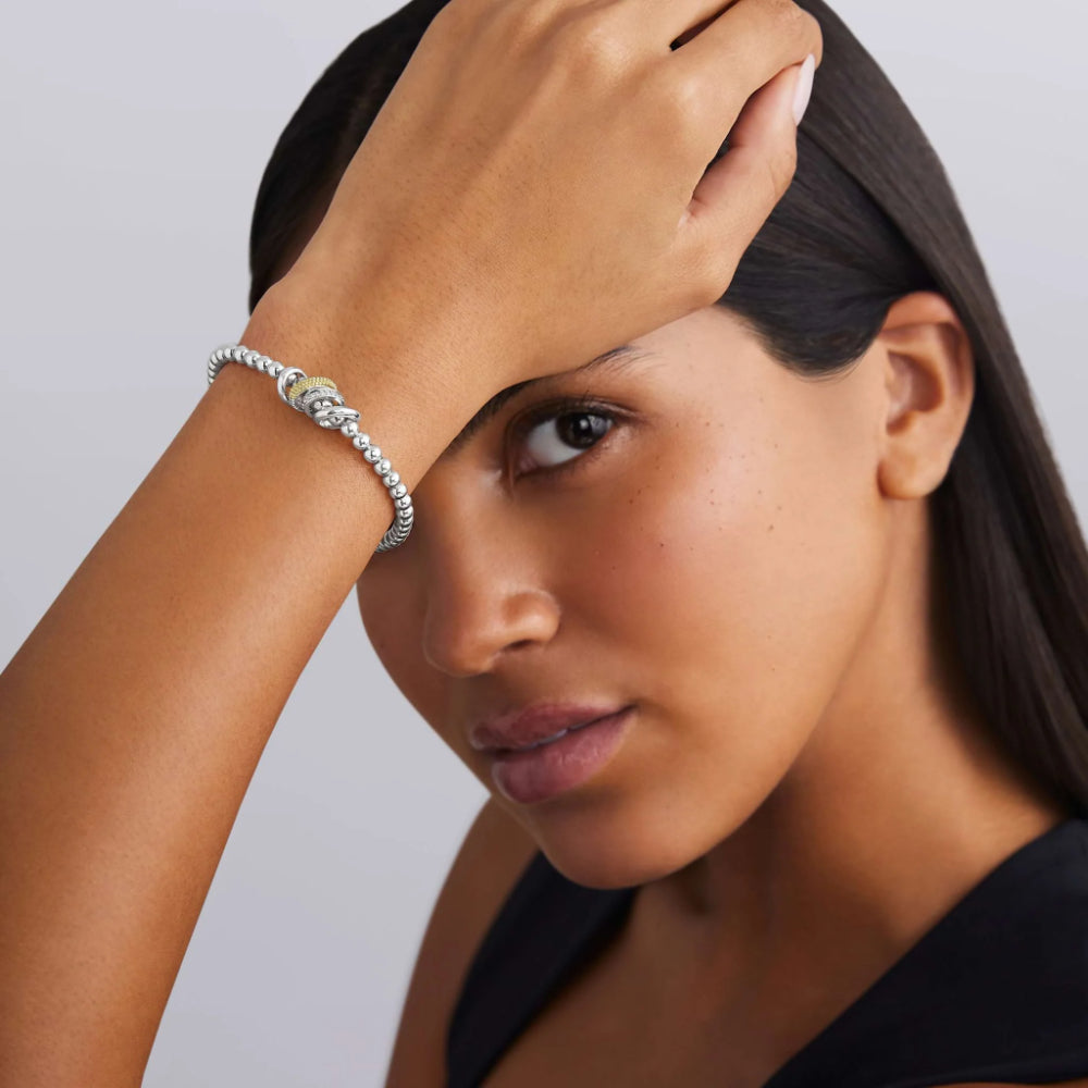 Smooth sterling silver, 18K gold superfine Caviar beading, and diamonds form four stationary rings on a stretch bracelet. LAGOS diamonds are the highest quality natural stones.