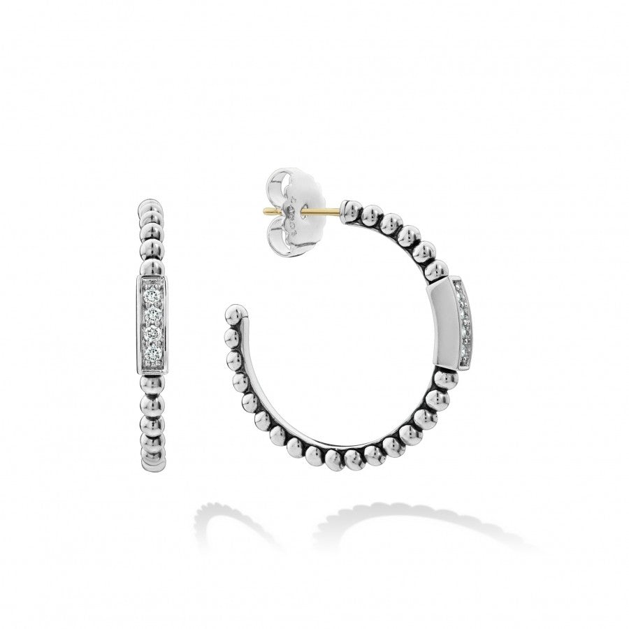 A diamond station accents this sterling silver Caviar beaded hoop earring. LAGOS diamonds are the highest quality natural stones.