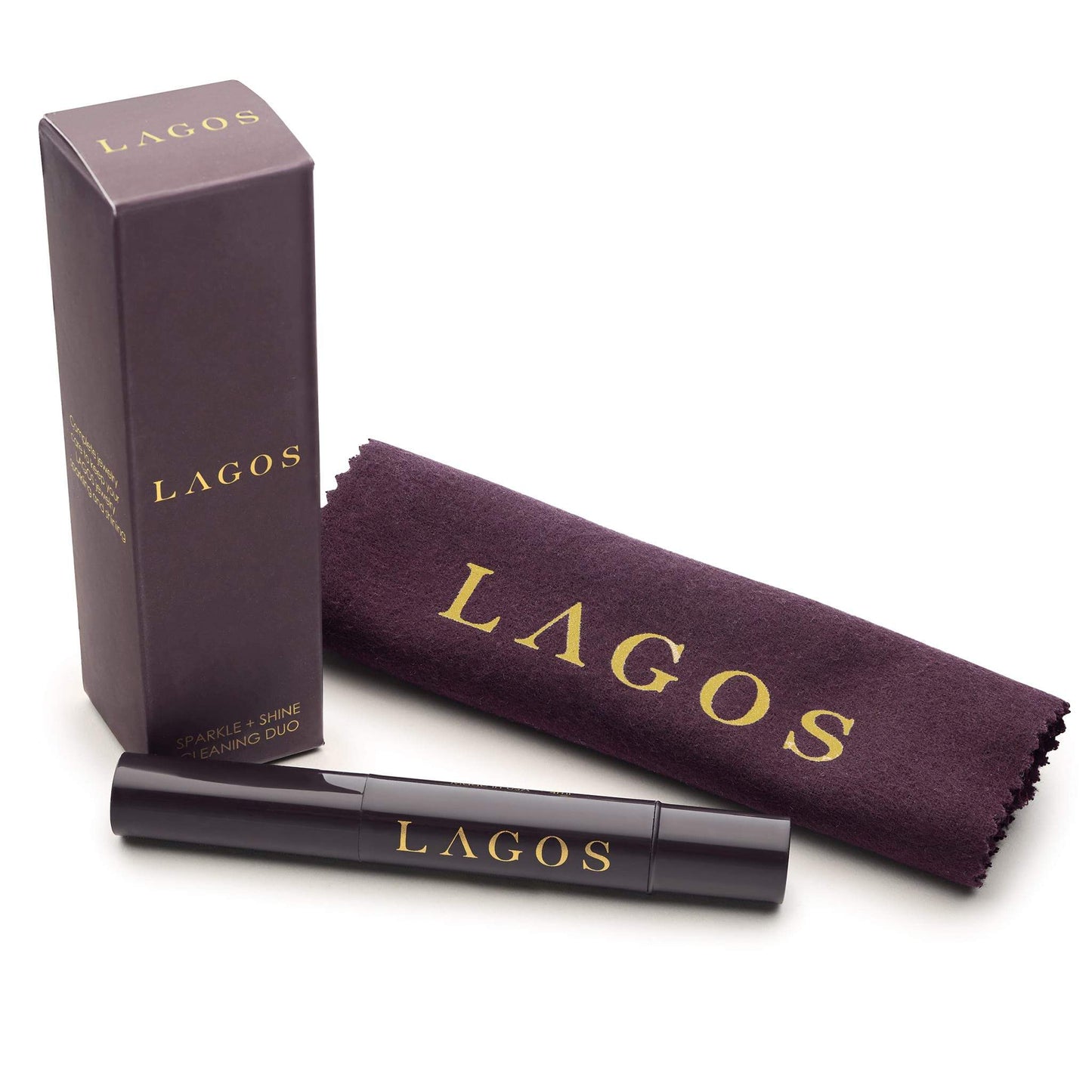 Custom LAGOS jewelry cleaner to care for your jewelry when you're on the go. Gentle for pearls, diamonds, ceramic and gemstones. Precious jewelry cleaner for metal jewelry with a brush top. Travel size of 4ml meets TSA guidelines. Packaging includes instructions and a polishing cloth.