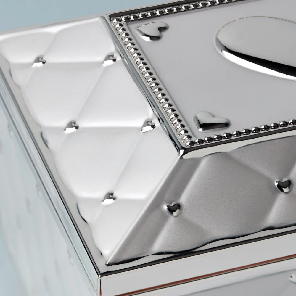 A classic! A perfectly poised ballerina balances en pointe when you open this charming jewelry box. The outside of the box bears a sculpted quilt pattern with dozens of tiny hearts - plus a large heart on the front and top. Inside, the pink-lined box has compartments for rings and a little girl's favorite things.