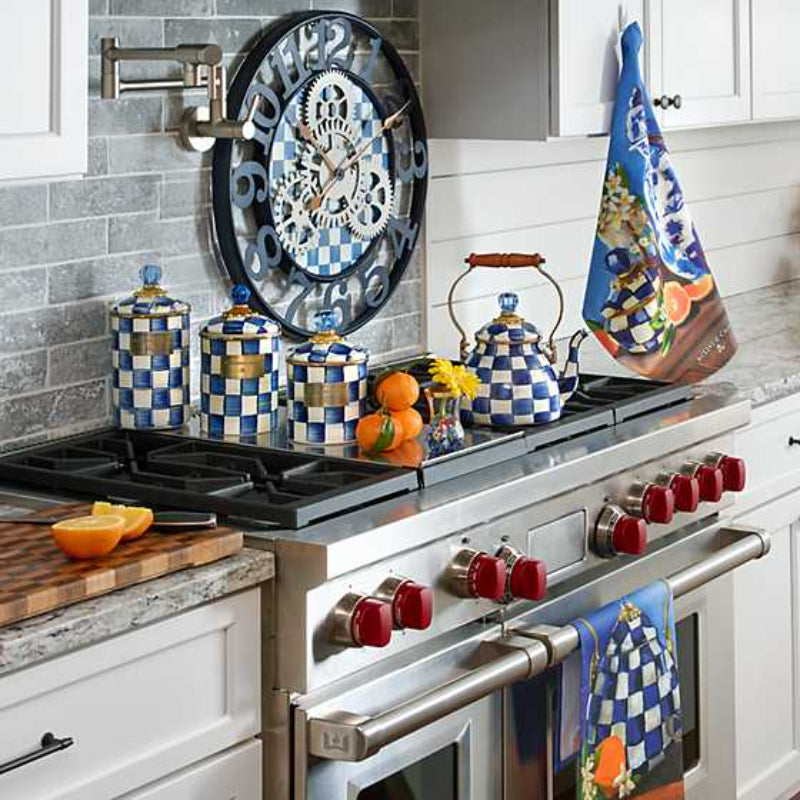 Sync your schedule to MacKenzie-Childs time. Our Small Royal Check Farmhouse Wall Clock is the perfect timekeeper in any room, from the kitchen to the board room. Featuring our Royal Checks and exposed clock gears in the center, encircled by iron numbers, it makes watching the clock a charming activity.