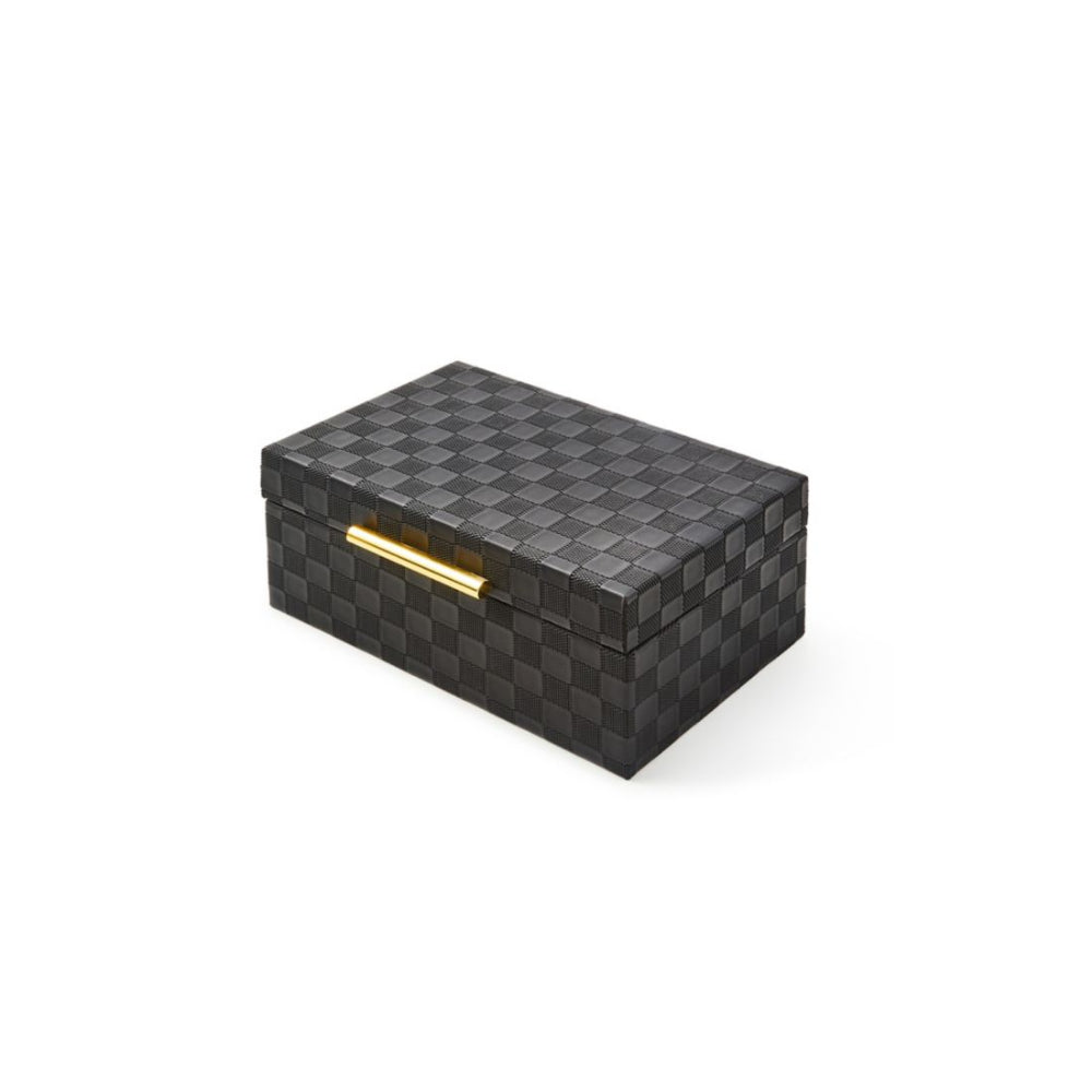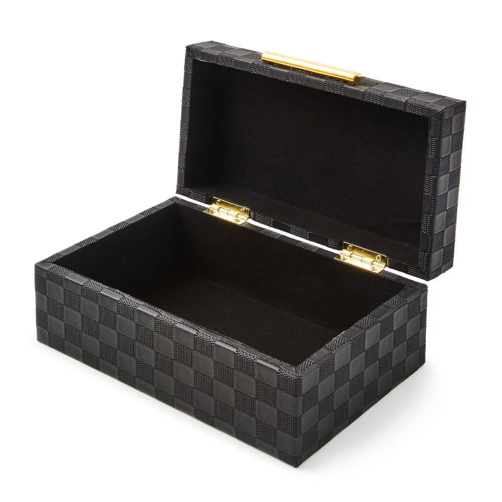 Make storage stylish with this small & large box featuring an embossed faux leather check surface and shiny gold hardware. It’s perfect for jewelry or other trinkets.