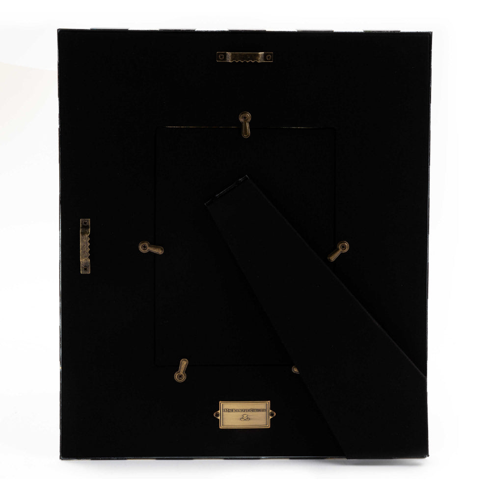 Heavy-gauge, hand-glazed steel underbody with hand-painted Courtly Checks. Glass pane. Easel back included; backing is covered with black linen and a brass logo plate.