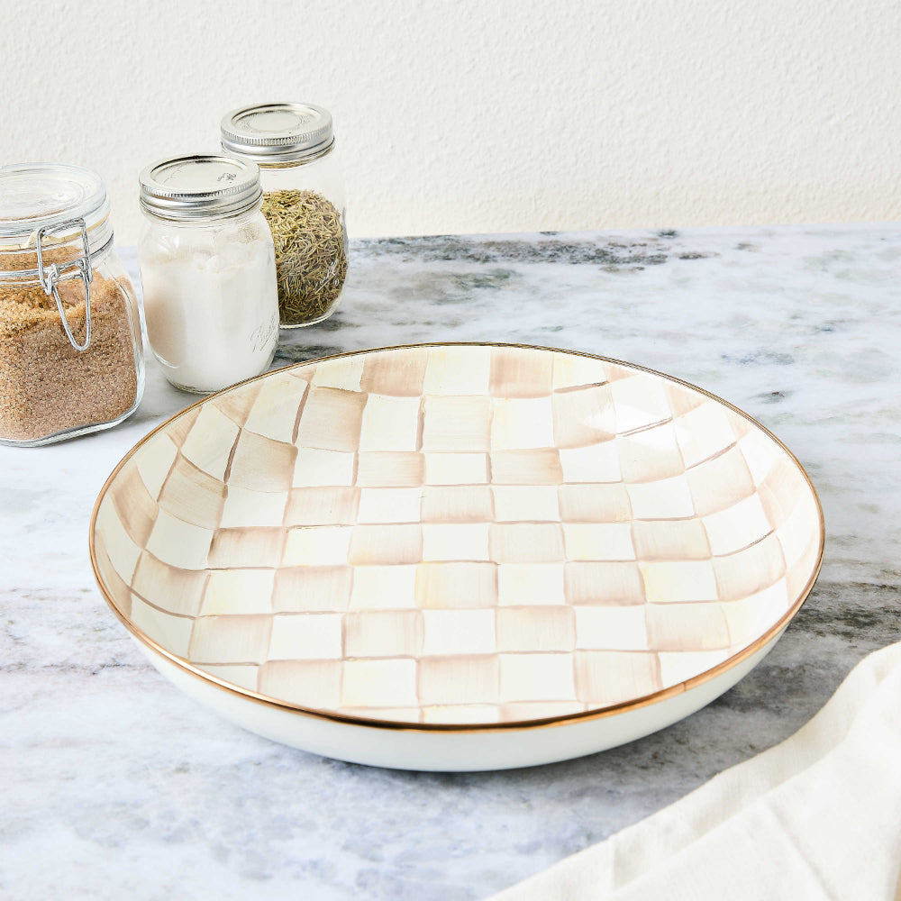 The Mocha Check Abundant Bowl handles serving in style. Its upturned edge is especially handy for presenting main courses that have a bit more sauce, like a heaping bowl of pasta. It features a heavy-gauge, hand-glazed steel underbody with hand-painted, coffee-colored checks and is trimmed with a bronzed stainless-steel rim.