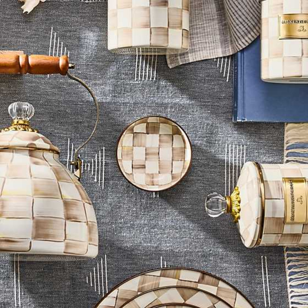 Serve snacks and relishes in style with the Mocha Check Relish Dish. Made of a heavy-gauge, hand-glazed steel underbody, it features hand-painted, coffee-colored checks and is trimmed with a bronzed stainless-steel rim.